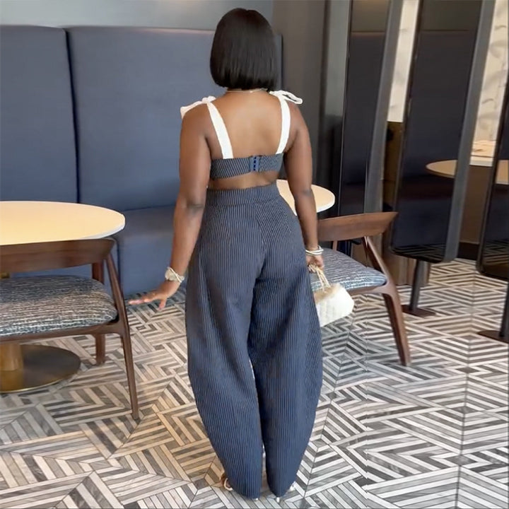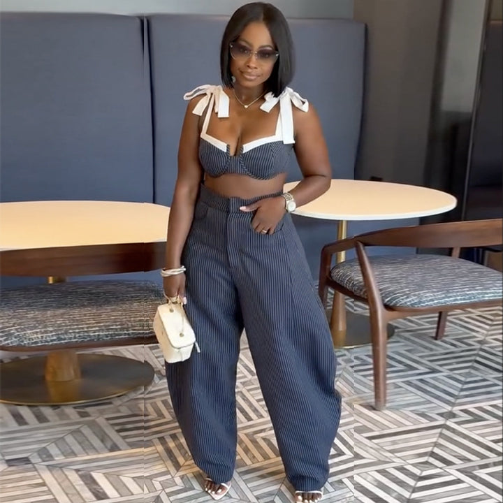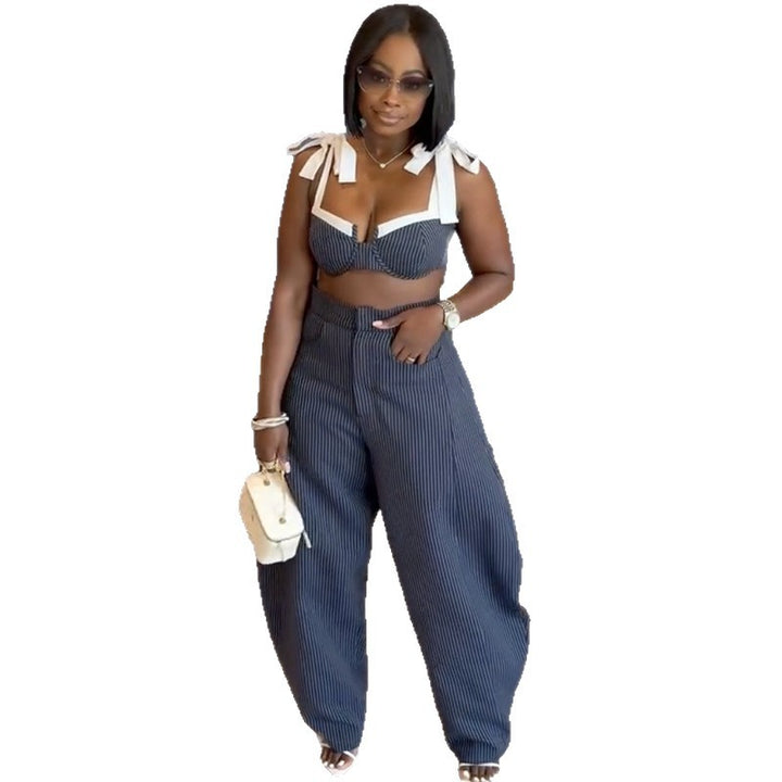European and American women's clothing 2025 autumn new fashionable and sexy splicing bow shoulder strap waist wide-leg pants set