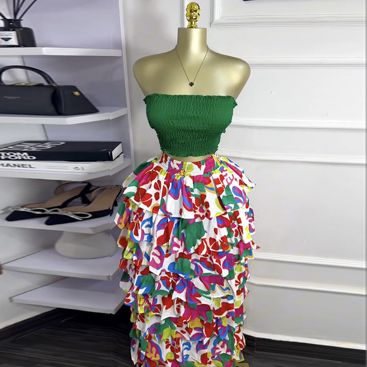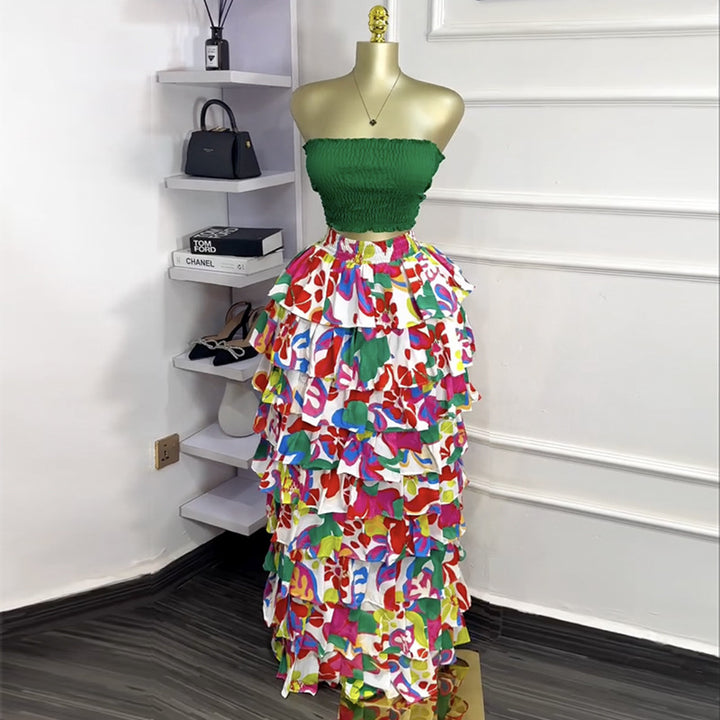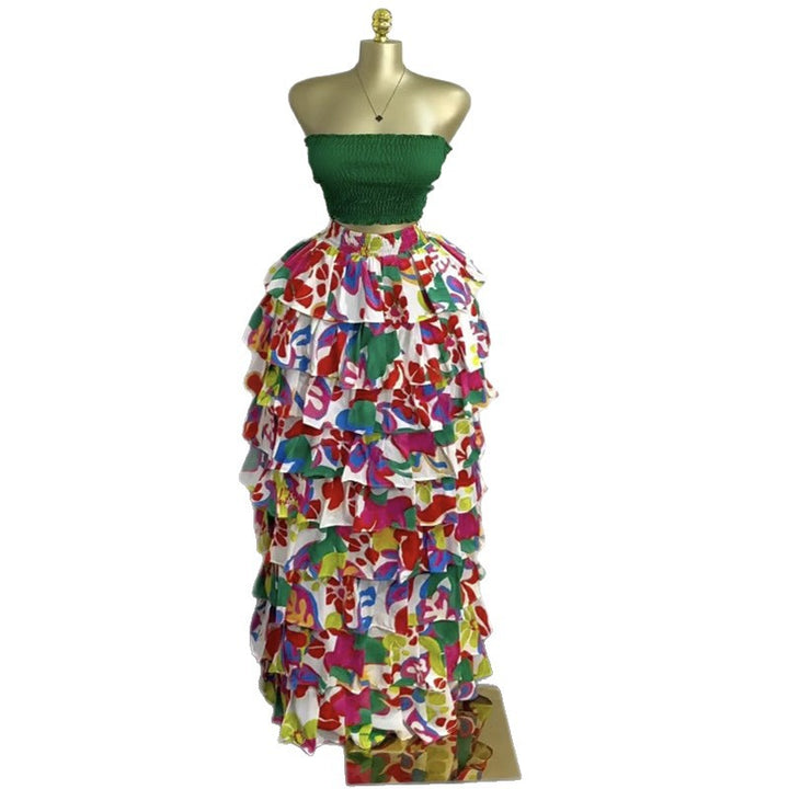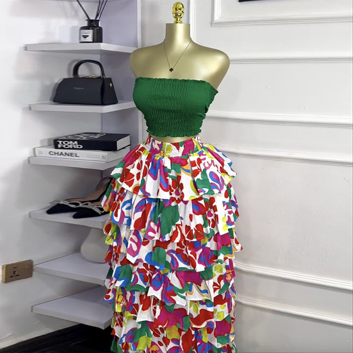European and American women's clothing 2025 autumn new fashionable and sexy tube top, waist and thin printed big swing skirt set