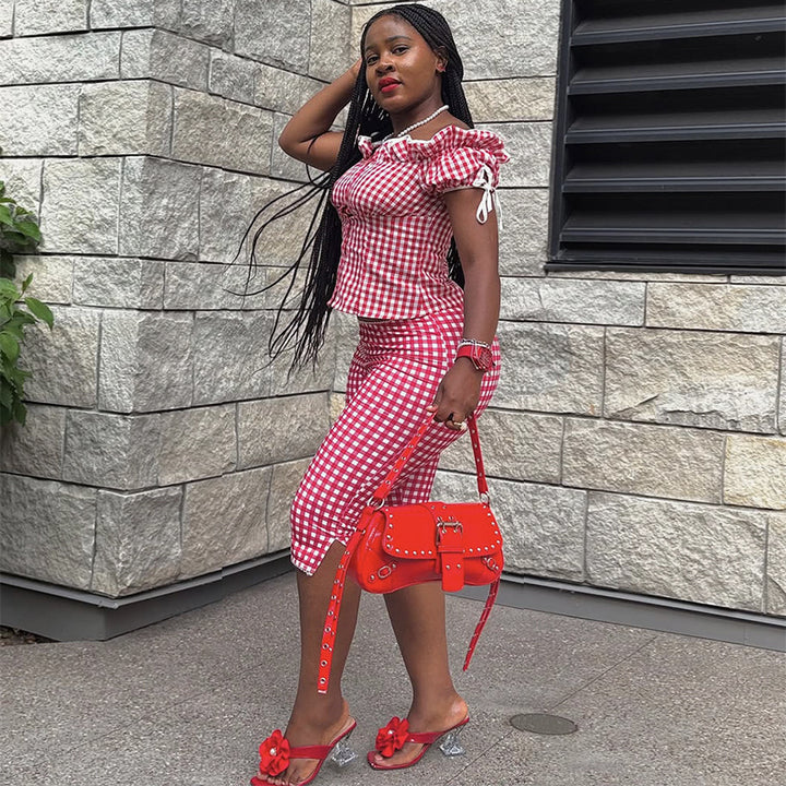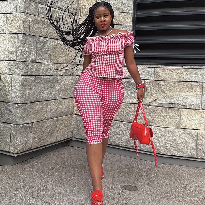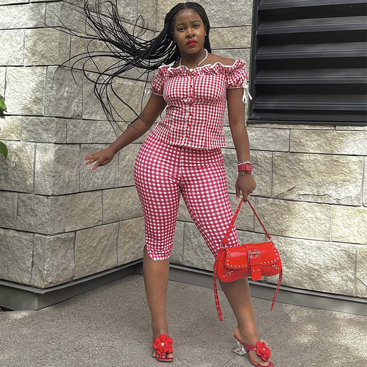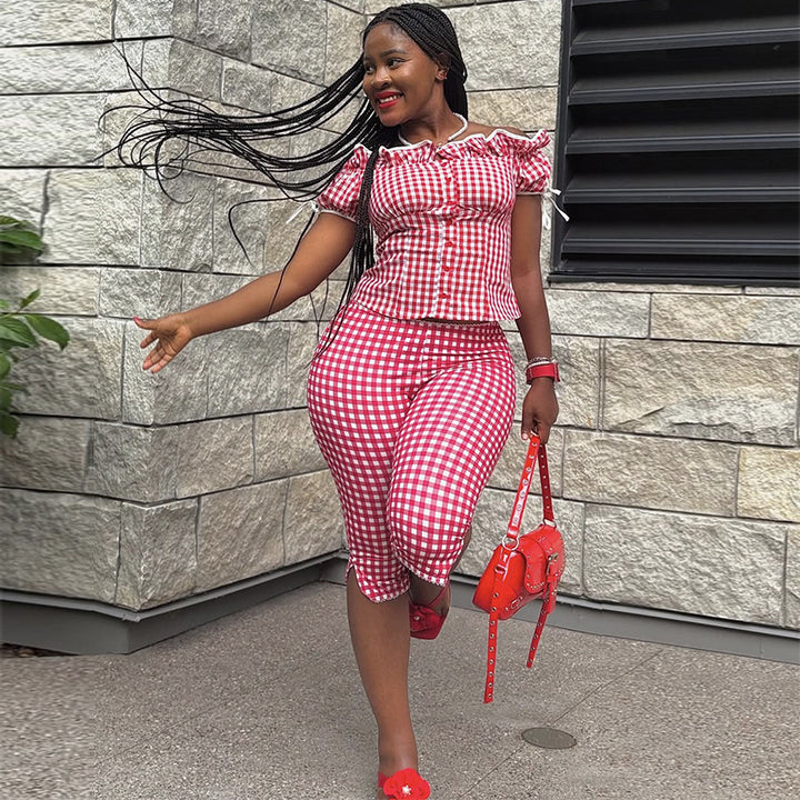 European and American women's clothing 2025 autumn new fashionable fresh ruffle edge plaid slim top cropped pants set
