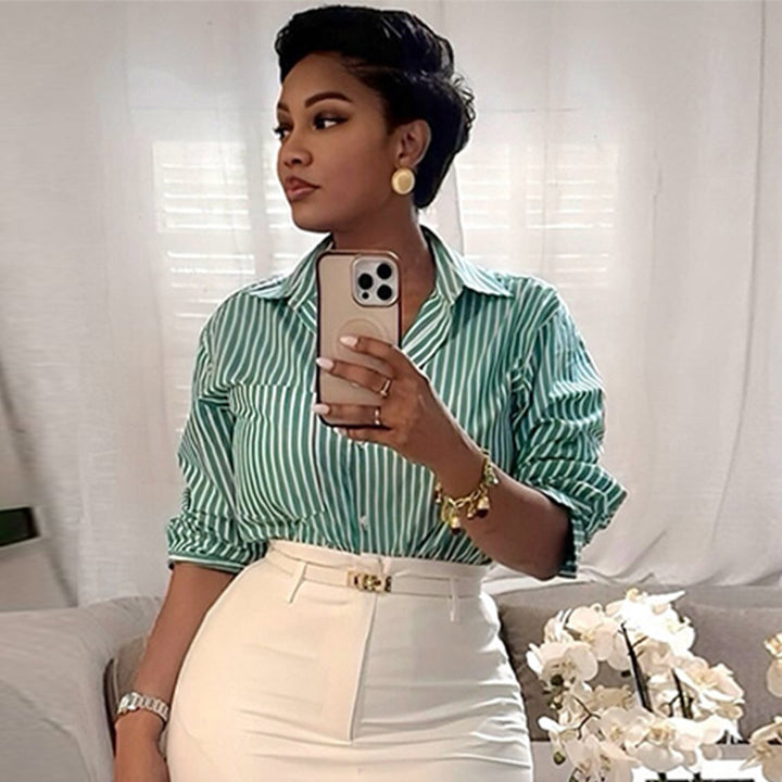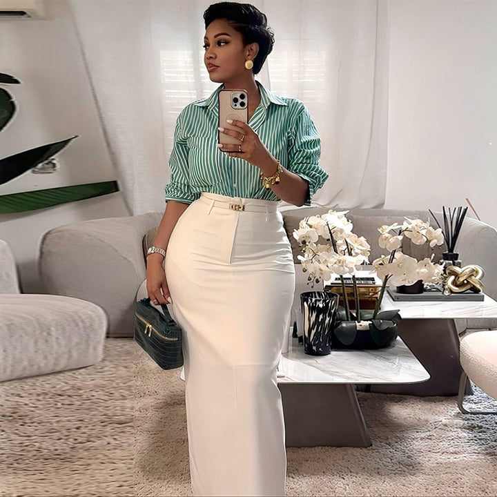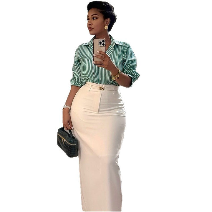 European and American women's clothing 2025 autumn new fashionable green striped long-sleeved shirt high waist skirt set