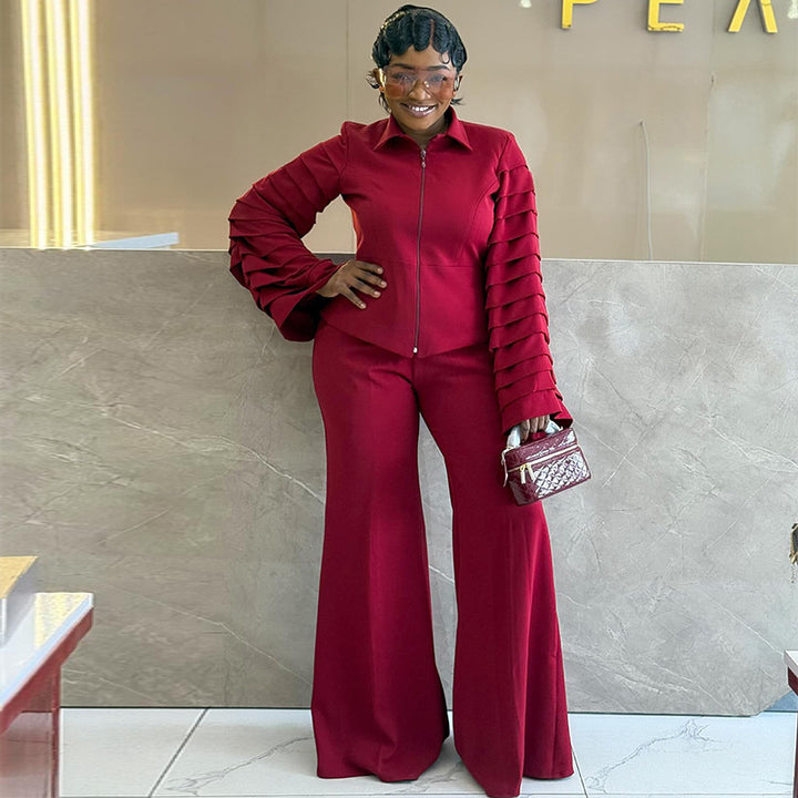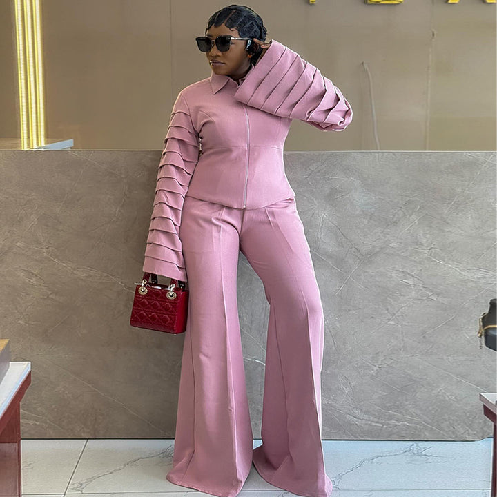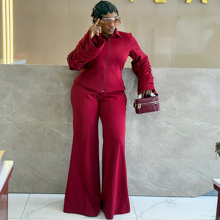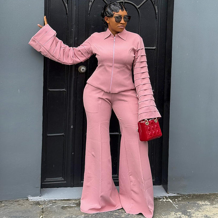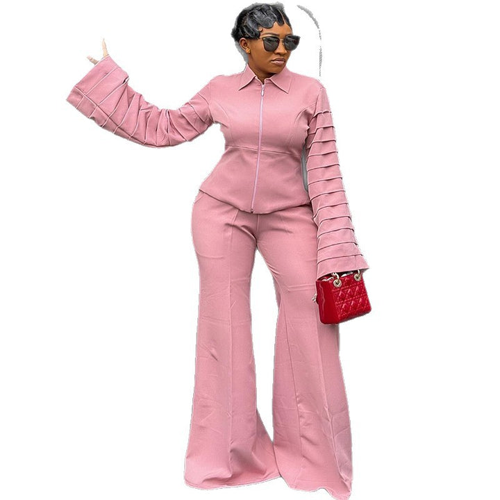 European and American women's clothing 2025 autumn new fashionable solid color zipper lapel waist top flared pants set