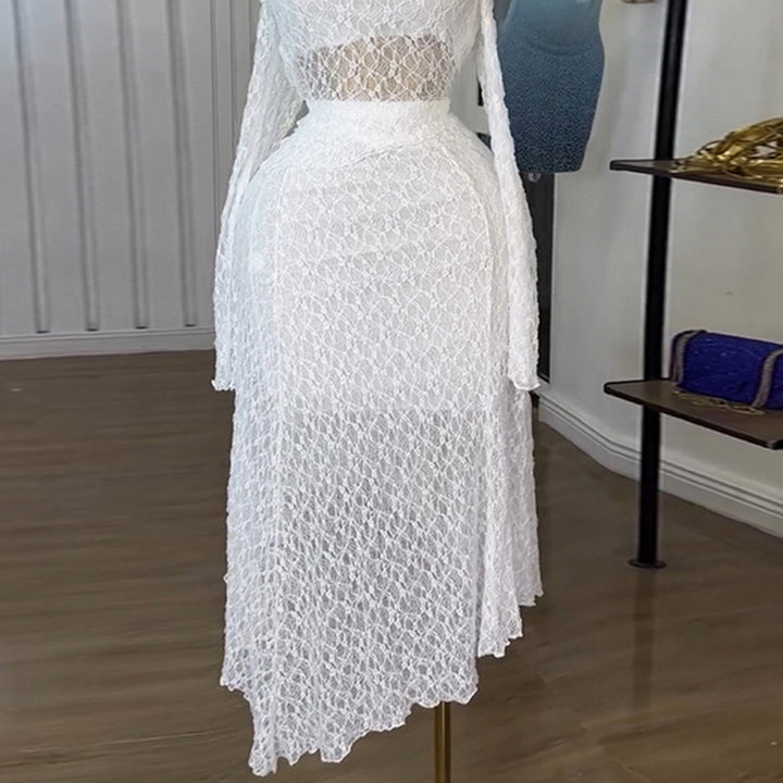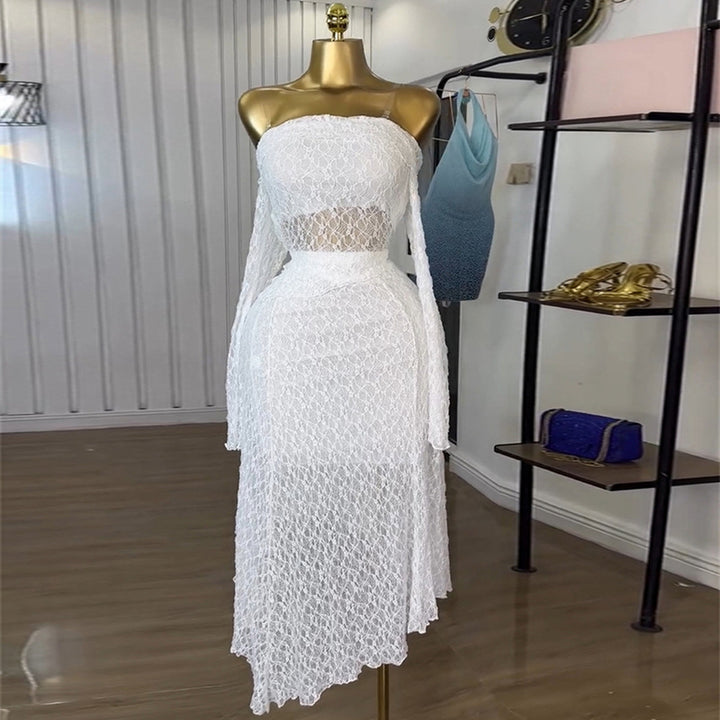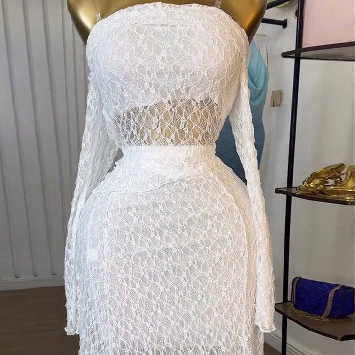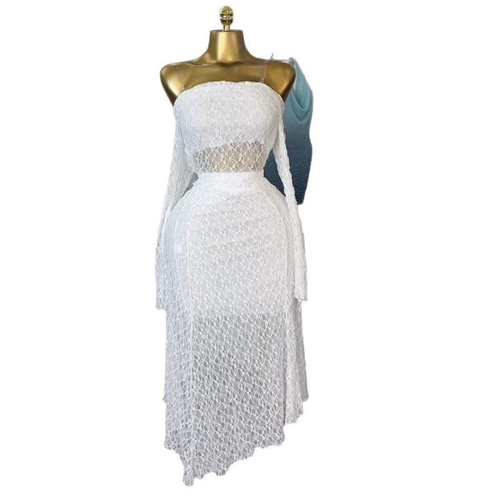 European and American women's clothing 2025 autumn new temperament one-word shoulder long-sleeved hollow lace top skirt set