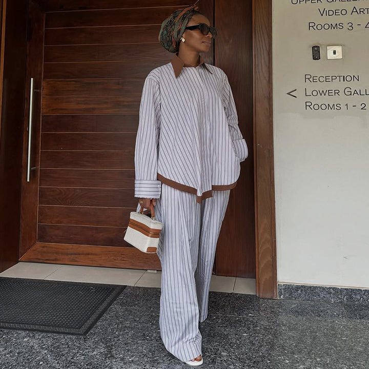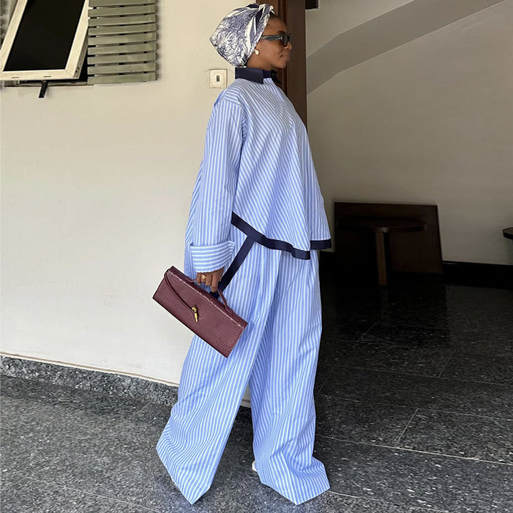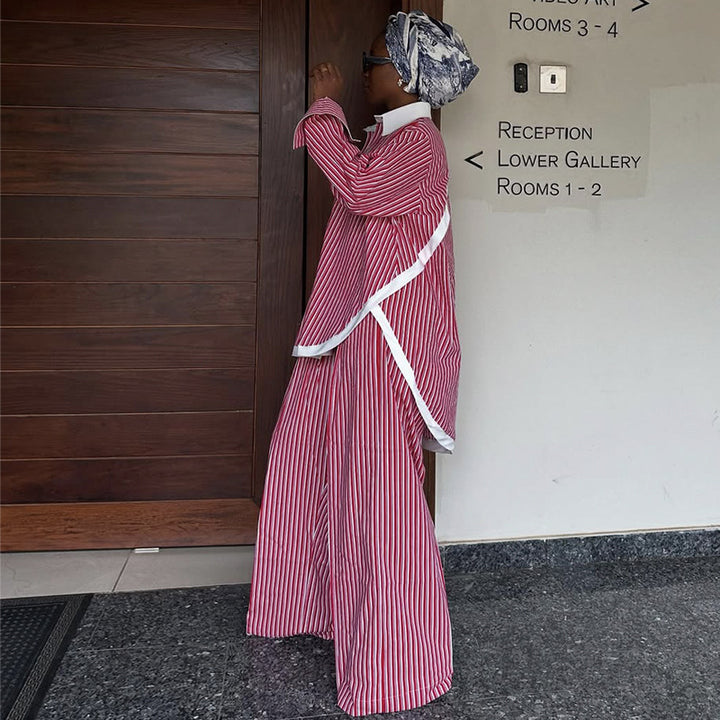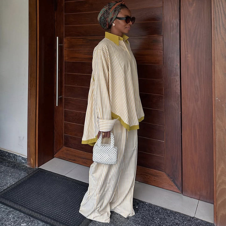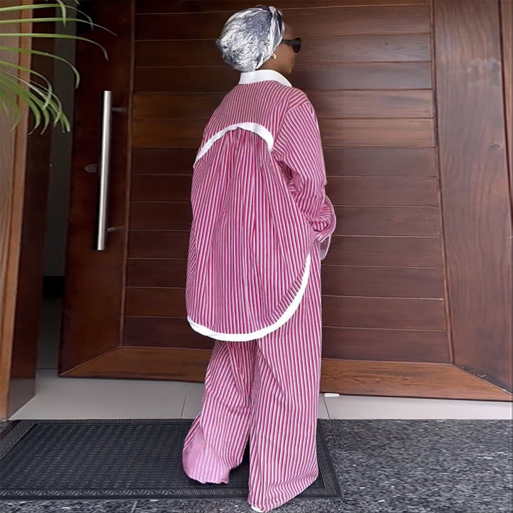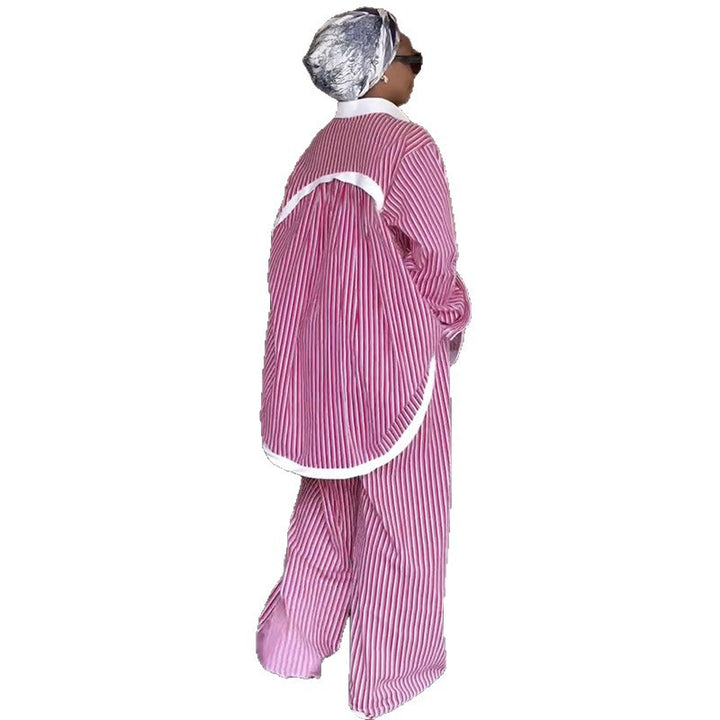 European and American women's clothing 2025 summer new fashion casual loose striped color matching shirt wide-leg pants set