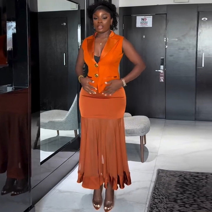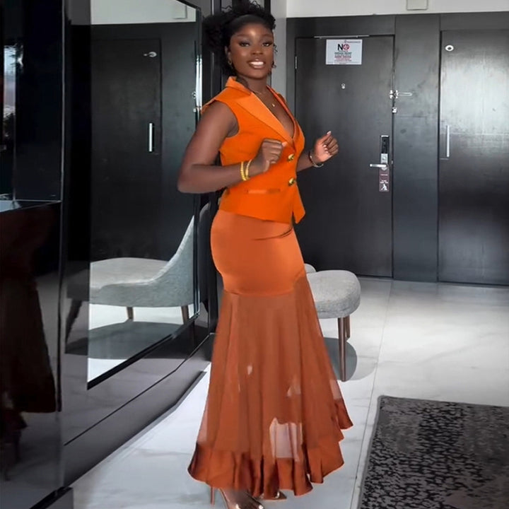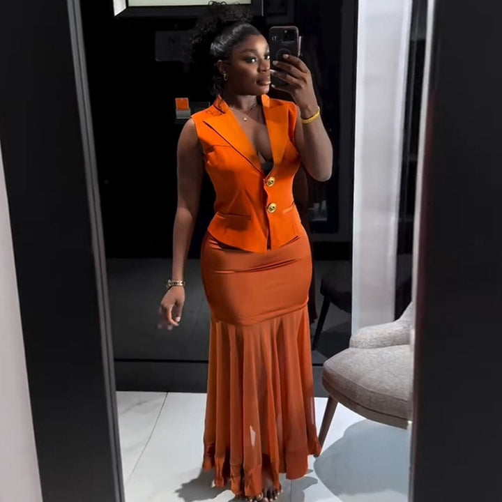 European and American women's clothing 2025 summer new fashion lapel sleeveless vest top pleated skirt set