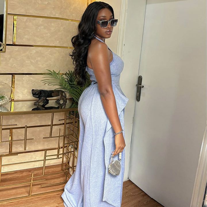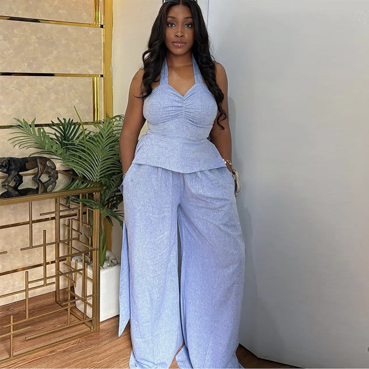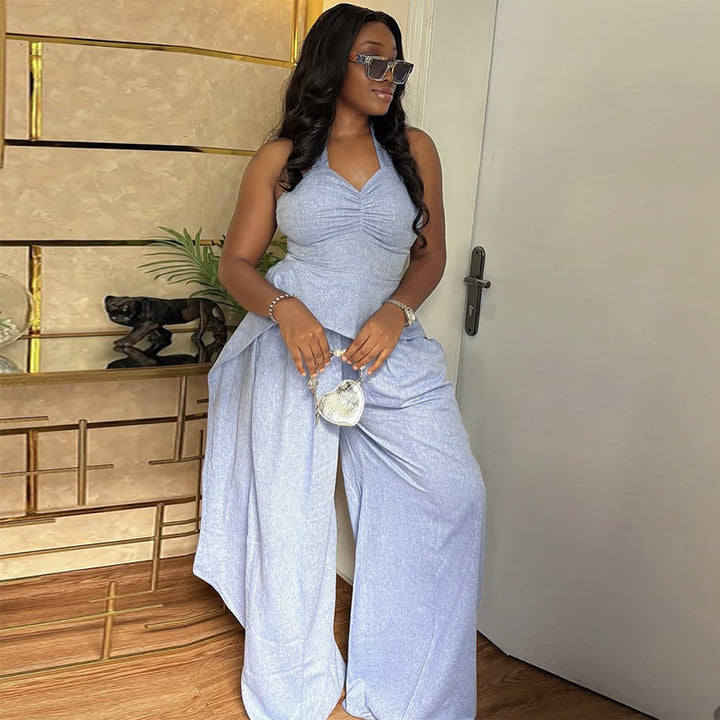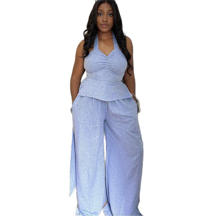 European and American women's clothing 2025 summer new fashion neck V-neck sleeveless solid color top wide-leg pants set