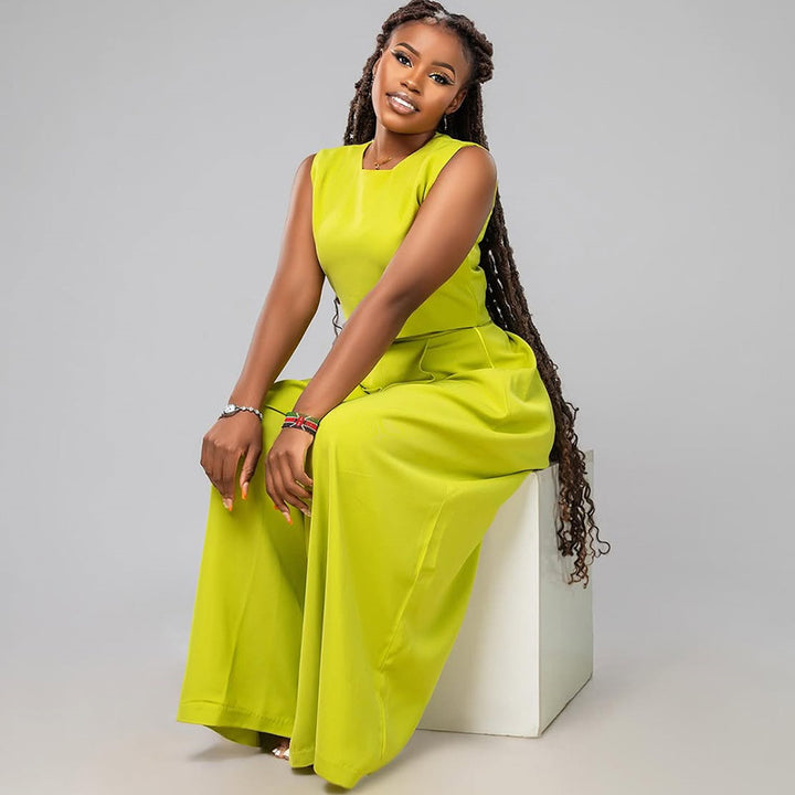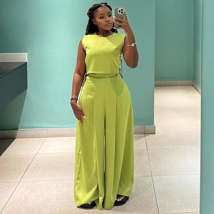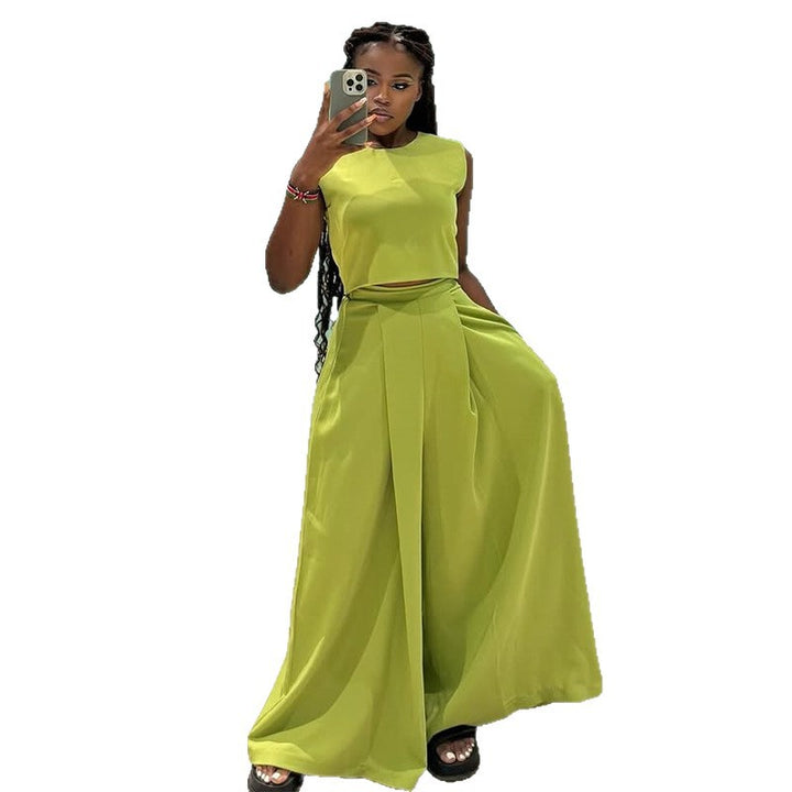 European and American women's clothing 2025 summer new fashion round neck sleeveless top high waist wide leg trousers casual suit