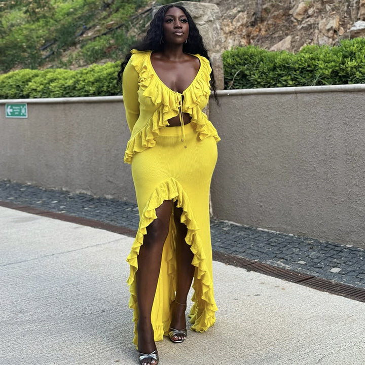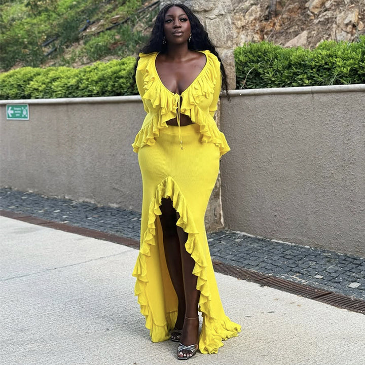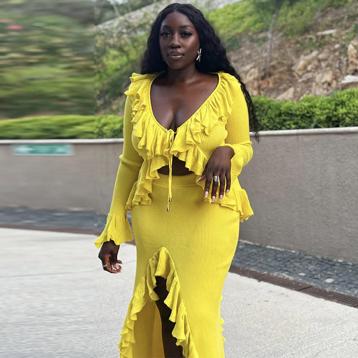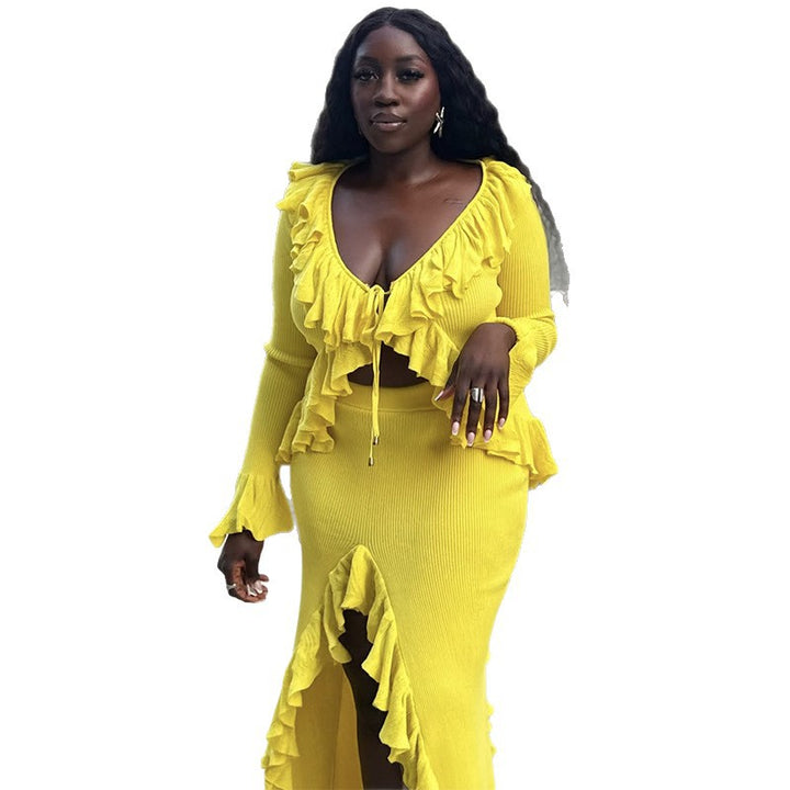 European and American women's clothing 2025 summer new fashion V-neck ruffle edge solid color top split hip skirt set