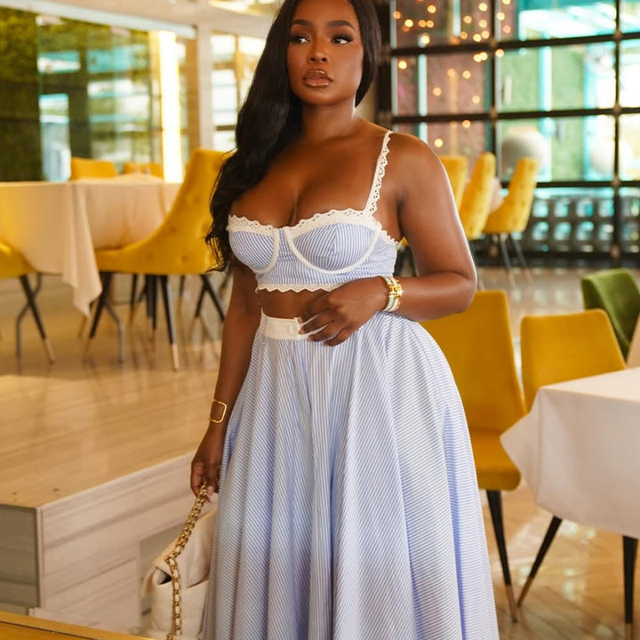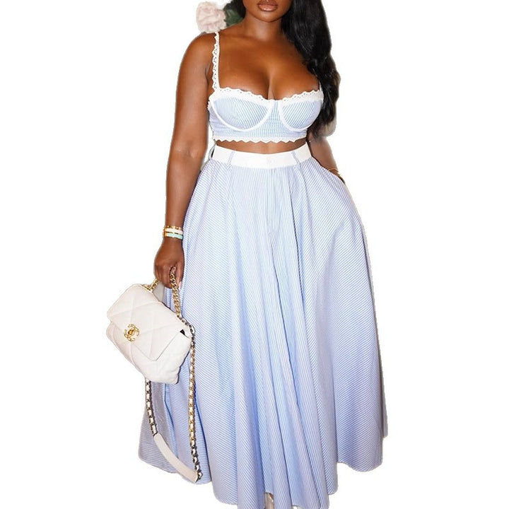 European and American women's clothing 2025 summer new fashionable blue striped sleeveless top high waist skirt set
