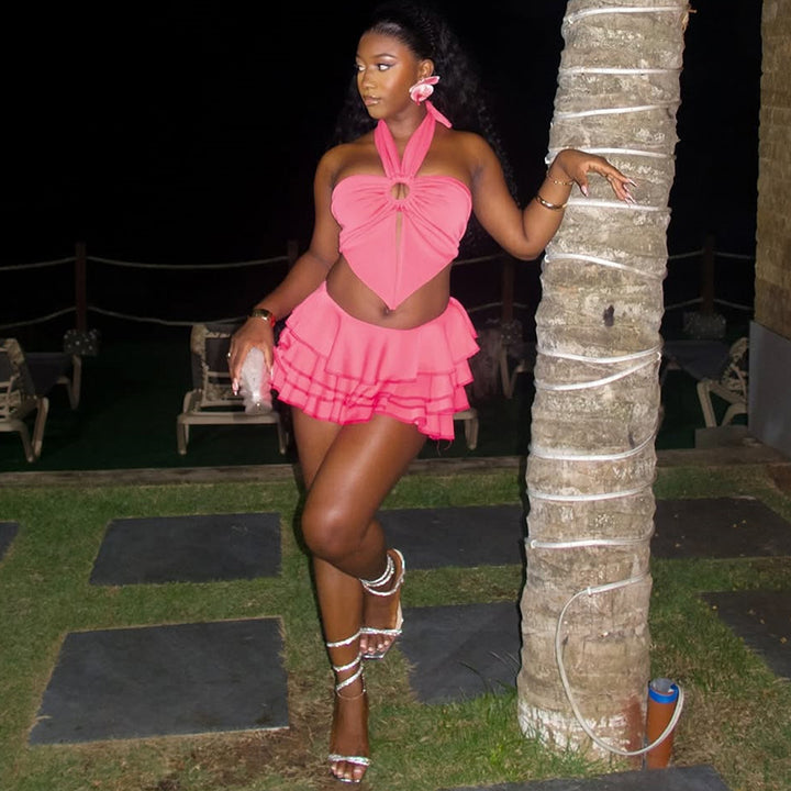 European and American women's clothing 2025 summer new sexy neck hollow short top ruffle edge skirt set