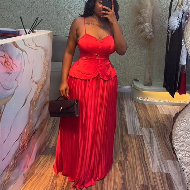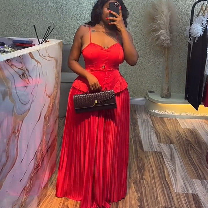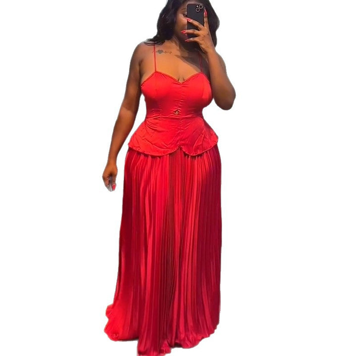 European and American women's clothing 2025 summer new sexy temperament red suspender top pleated skirt set