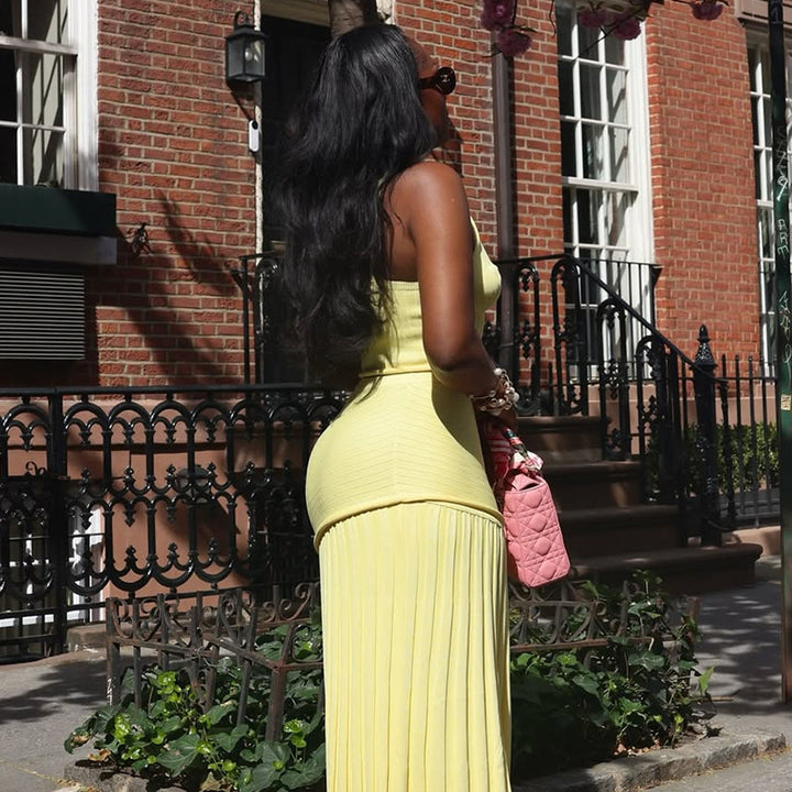 European and American women's clothing 2025 summer new solid color V-neck knitted suspender top pleated skirt set