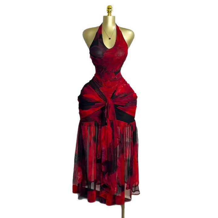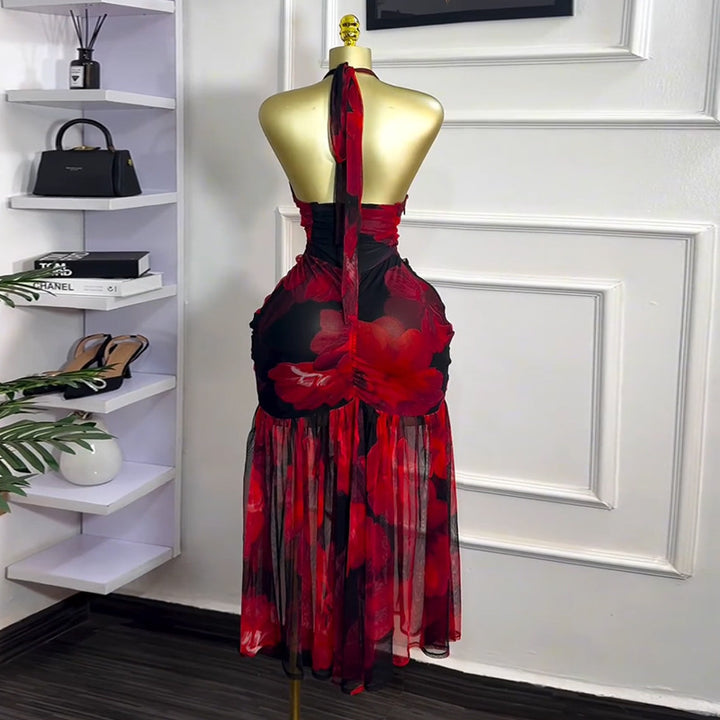 European and American women's clothing 2025 summer new sweet and fresh printed mesh yarn neck...