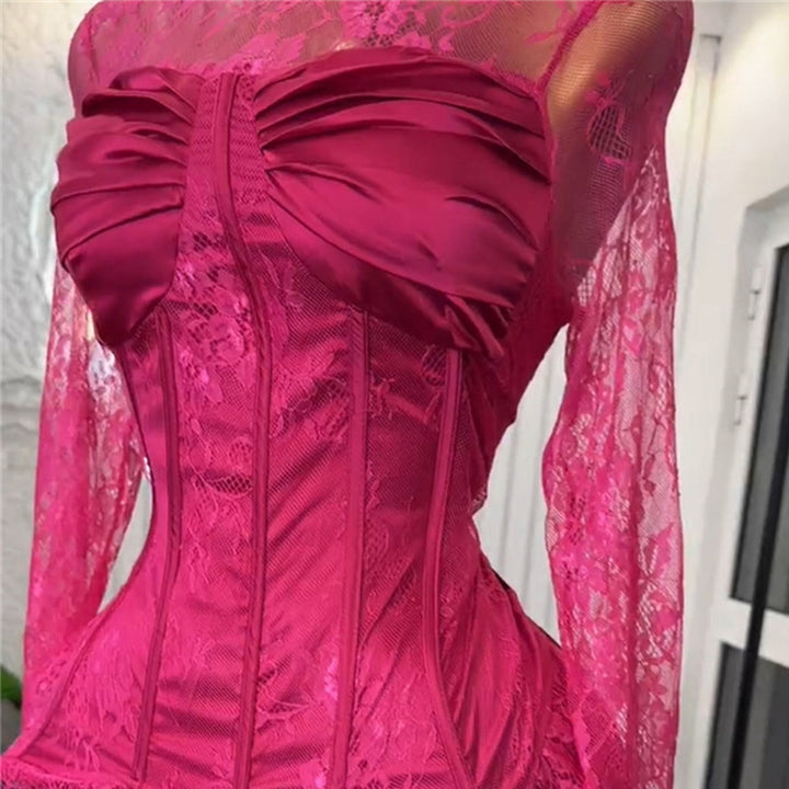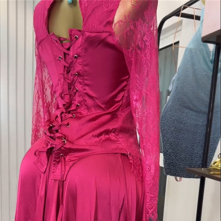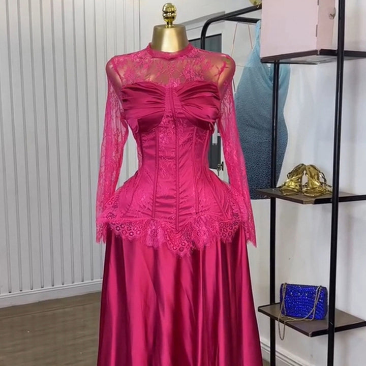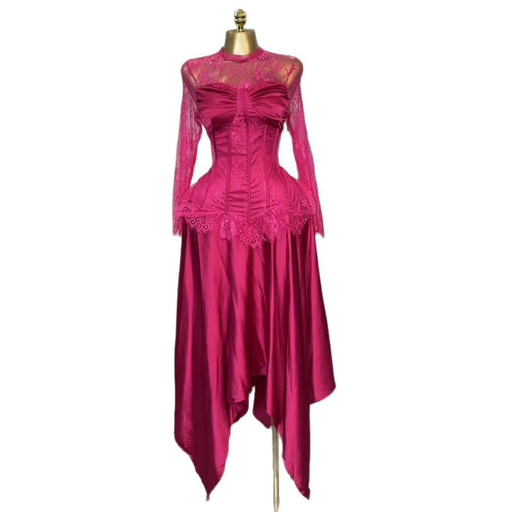 European and American women's clothing 2025 summer new temperament crew neck lace long-sleeved top irregular skirt set