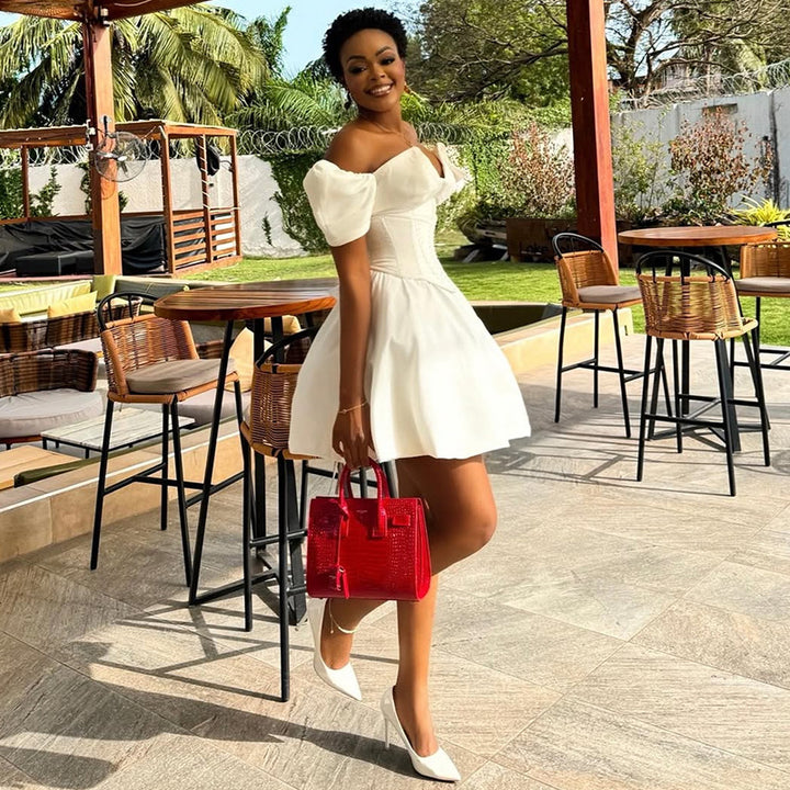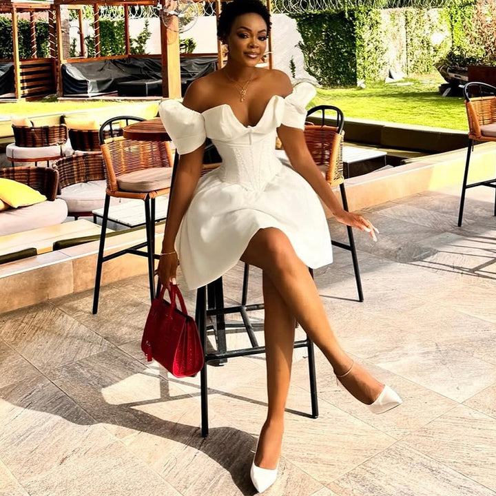 European and American women's clothing 2025 summer new temperament one-word shoulder irregular slim top puffy skirt set