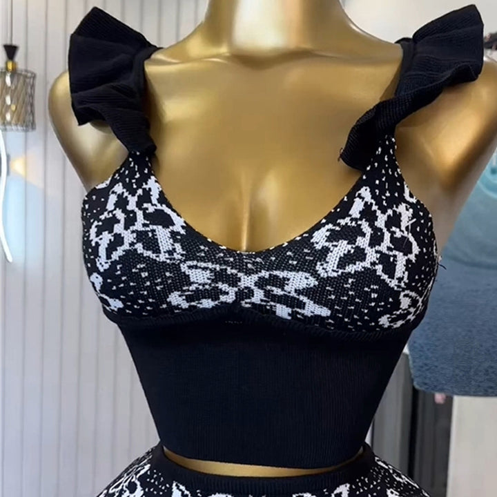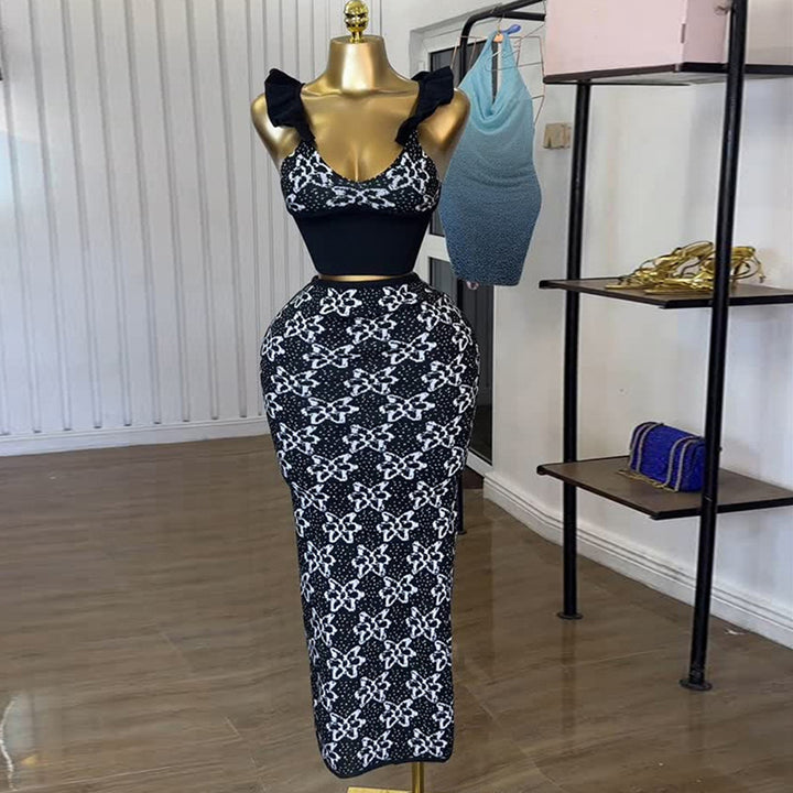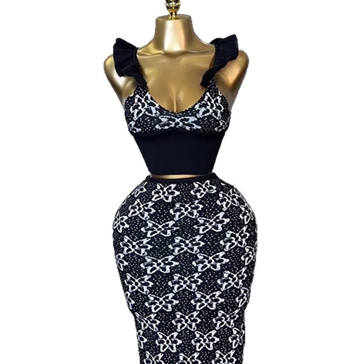 European and American women's clothing 2025 summer new temperament printed suspender vest high waist hip skirt set