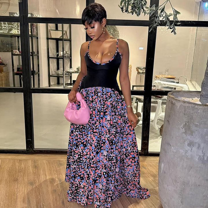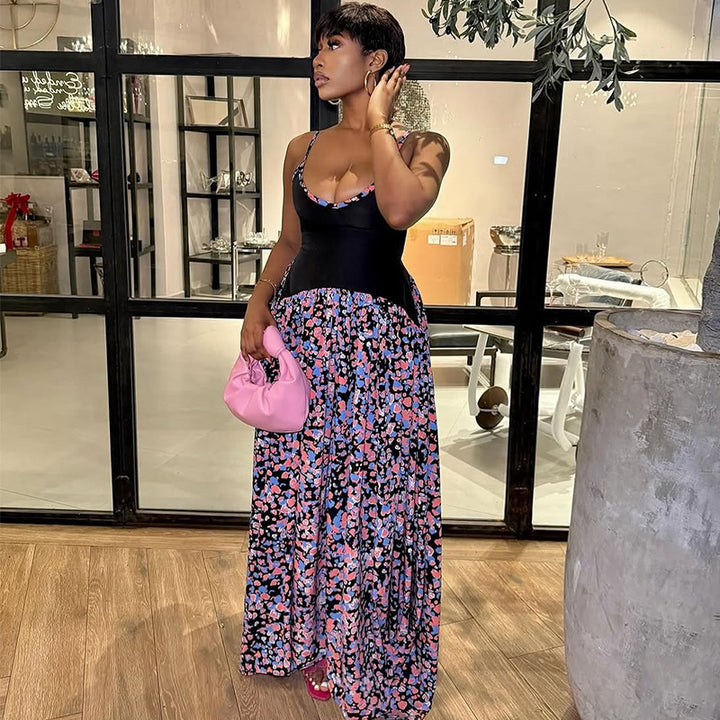 European and American women's clothing 2025 summer new temperament V-neck printed high-waisted pleated skirt long suspender dress