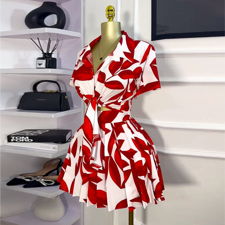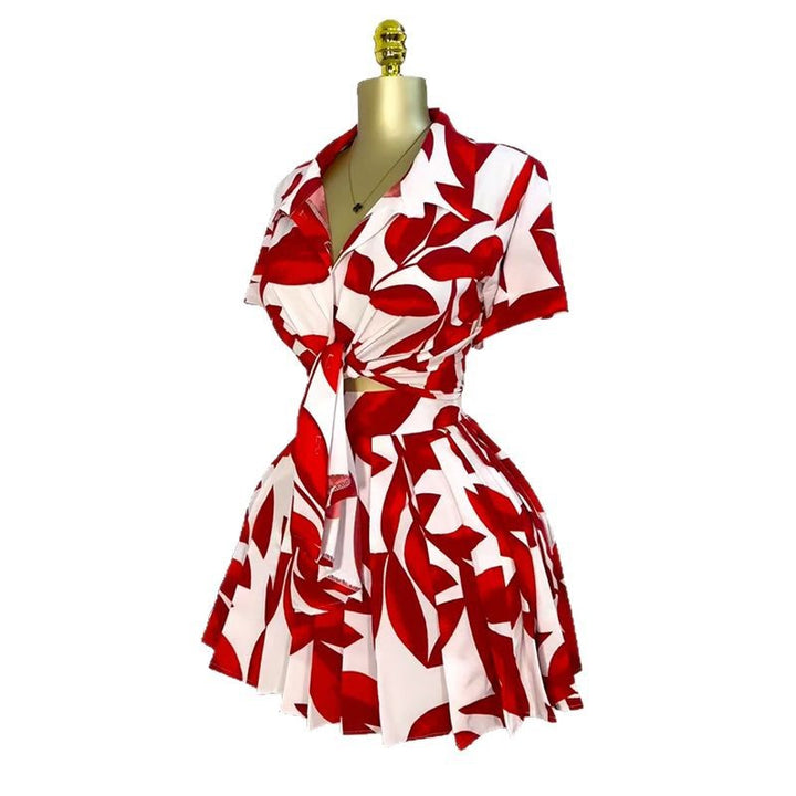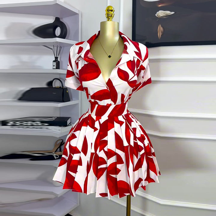 European and American women's clothing 2025 summer sweet and fresh printing lapel collar short-sleeved shirt high waist pleated skirt two-piece set