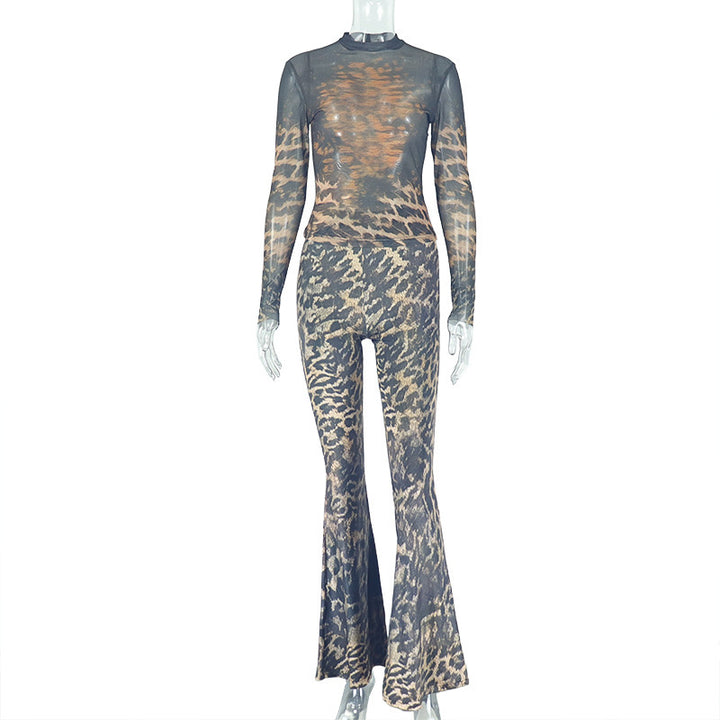 European and American women's clothing, fashionable and sexy slightly transparent leopard print pants set, high-neck long-sleeved top, long pants ...