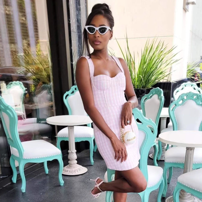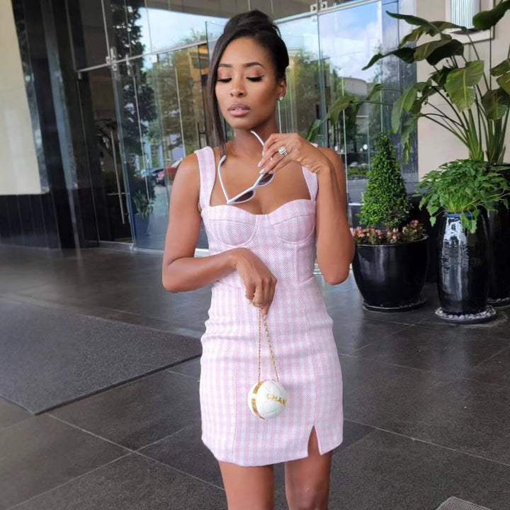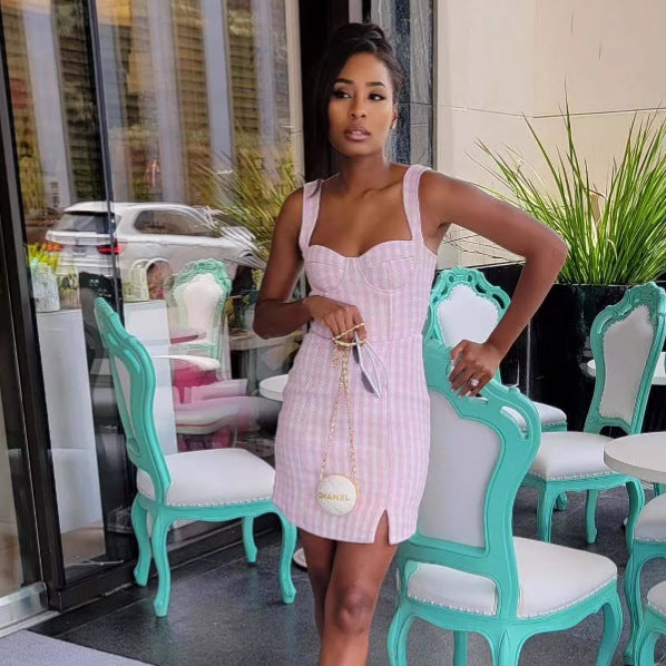 European and American women's clothing high-end sense thousand bird grid waist thin dress women's African split fork foreign style suspender short ...
