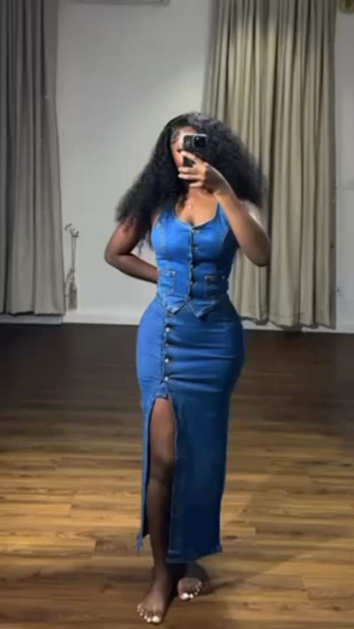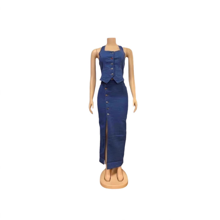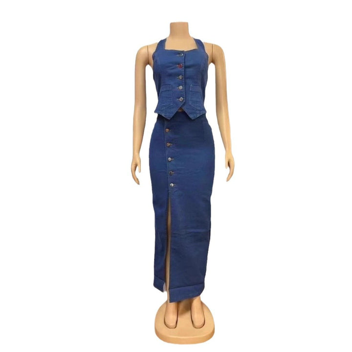 European and American women's clothing hot sale new fashion button pocket neck split denim dress set