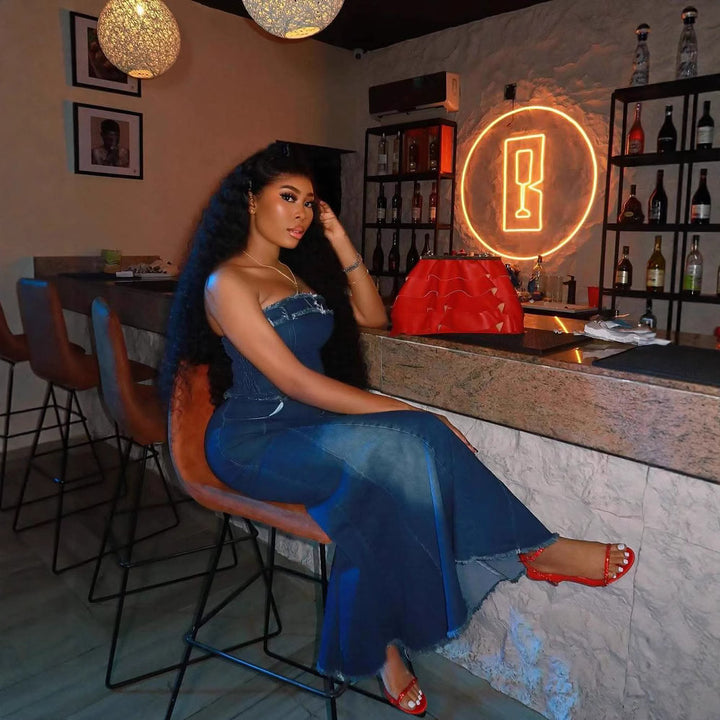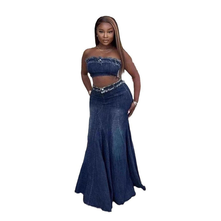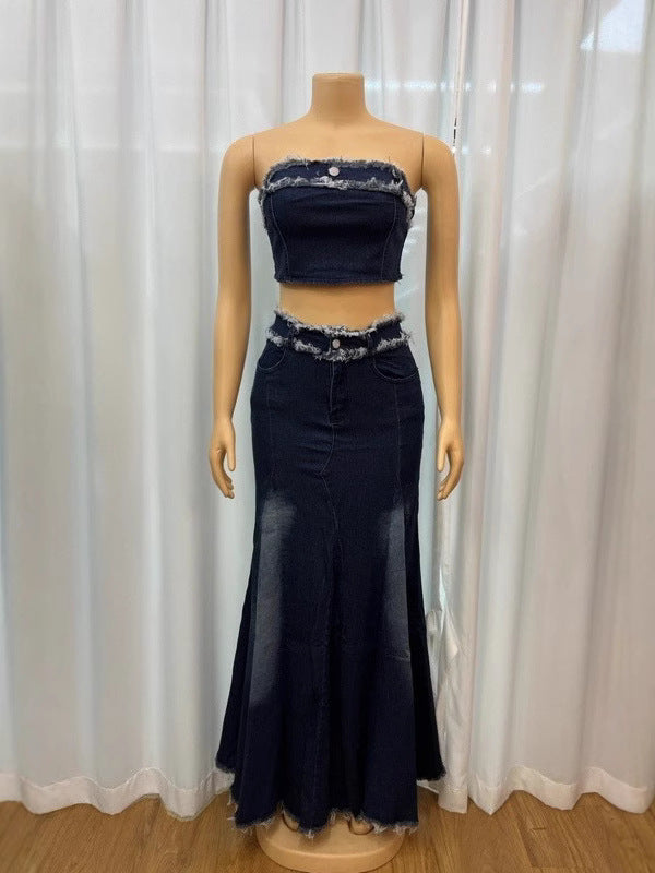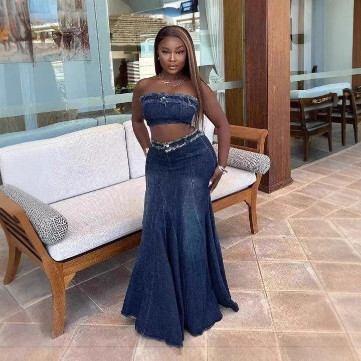 European and American women's clothing hot sale new fashionable sexy tube top waist denim dress set