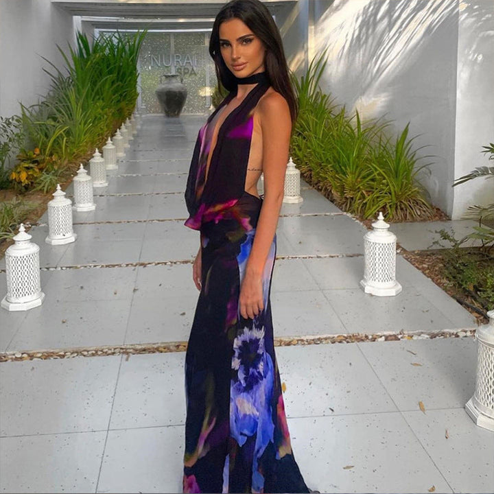 European and American women's clothing manufacturers 2023 new digital printing sexy drape collar long medium and long dress