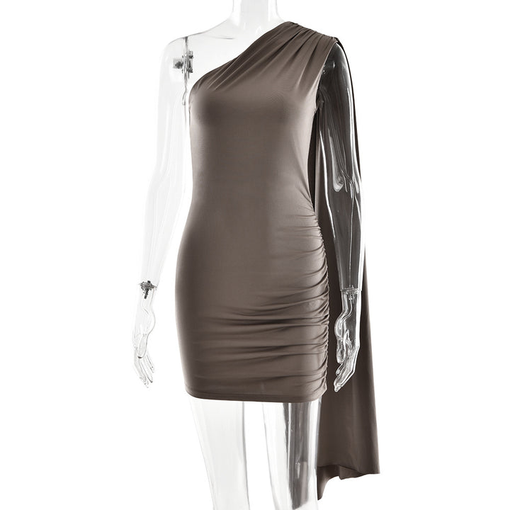 European and American women's clothing new 2025 summer solid color shoulder hip skirt sexy slim pleated streamer dress