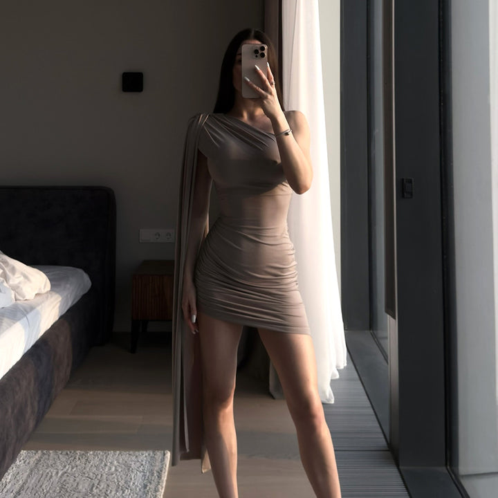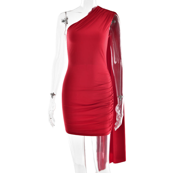 black, red, khaki, Using milk silk fabric, single shoulder pleated hip design |
