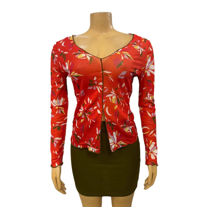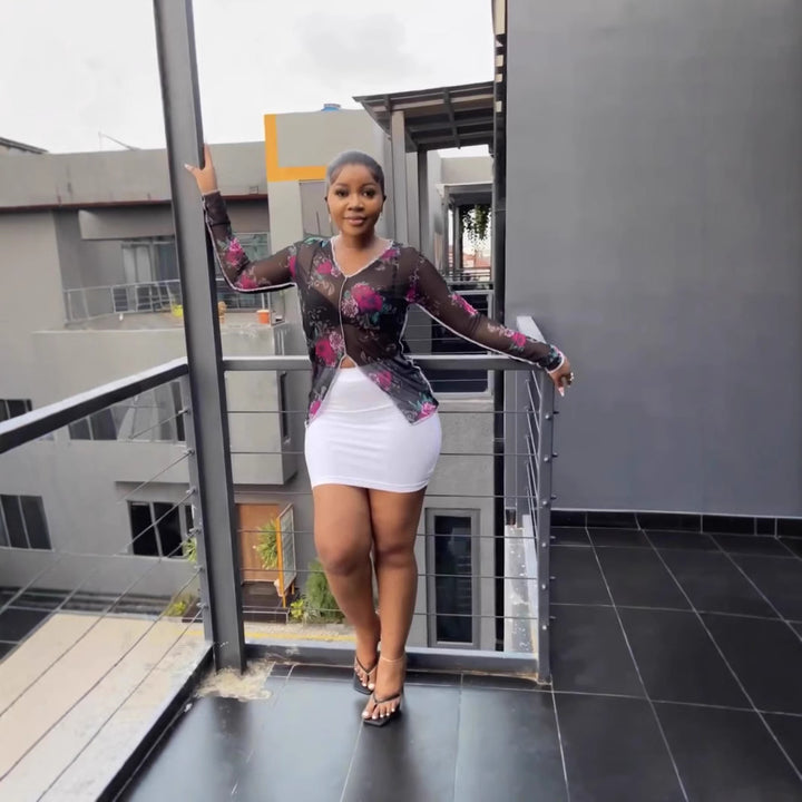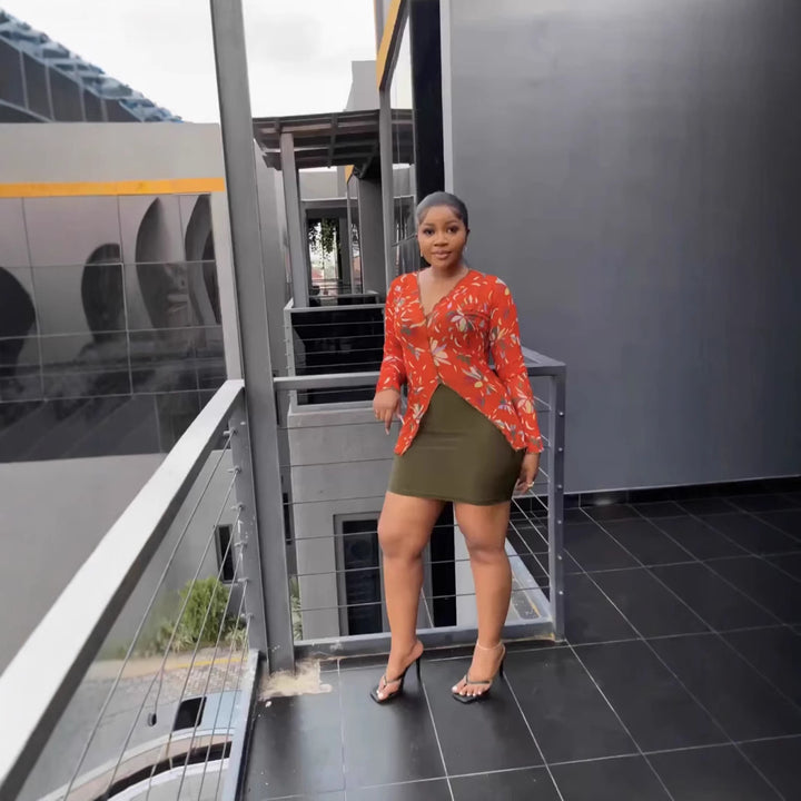 European and American women's clothing new printed long-sleeved cardigan V-neck top, solid color hip-wrapped short skirt set