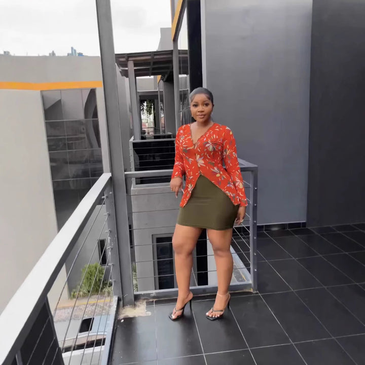 European and American women's clothing new printed long-sleeved cardigan V-neck top, solid color hip-wrapped short skirt set