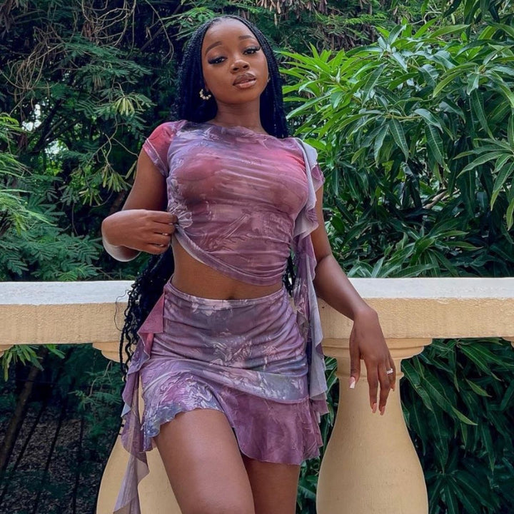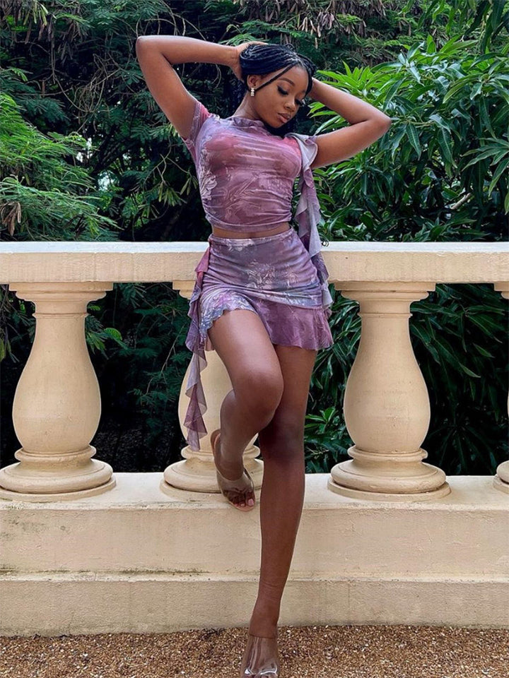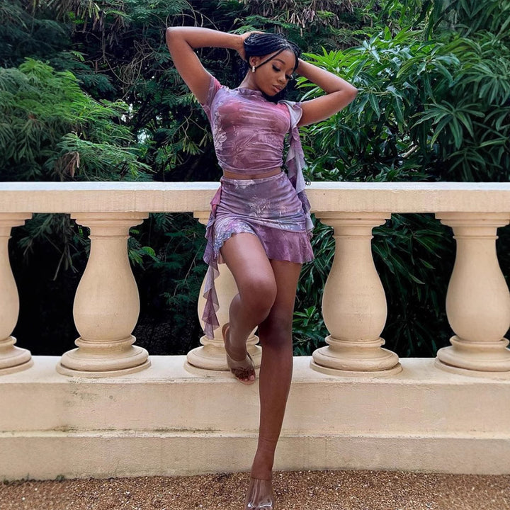 European and American women's clothing new printed semi-turtleneck short-sleeved navel top, ruffle edge skirt set