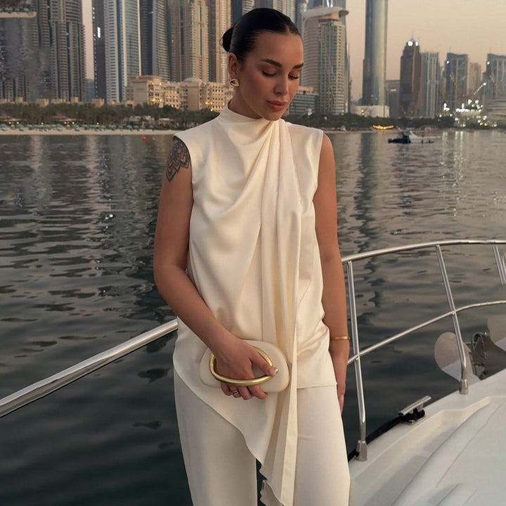 European and American women's clothing new semi-turtleneck button-up sleeveless top design sense casual temperament irregular T-shirt women