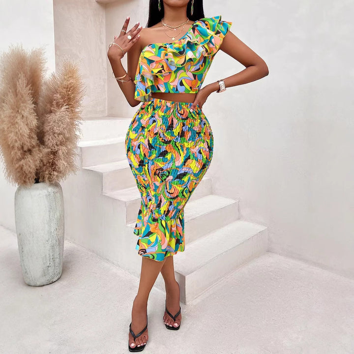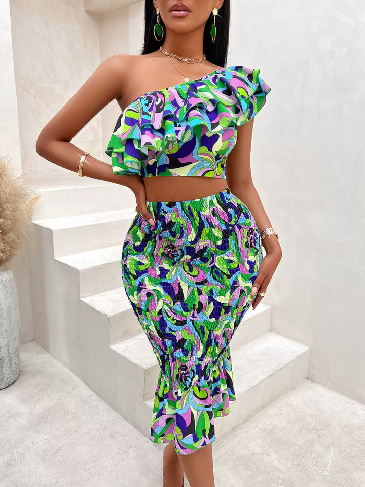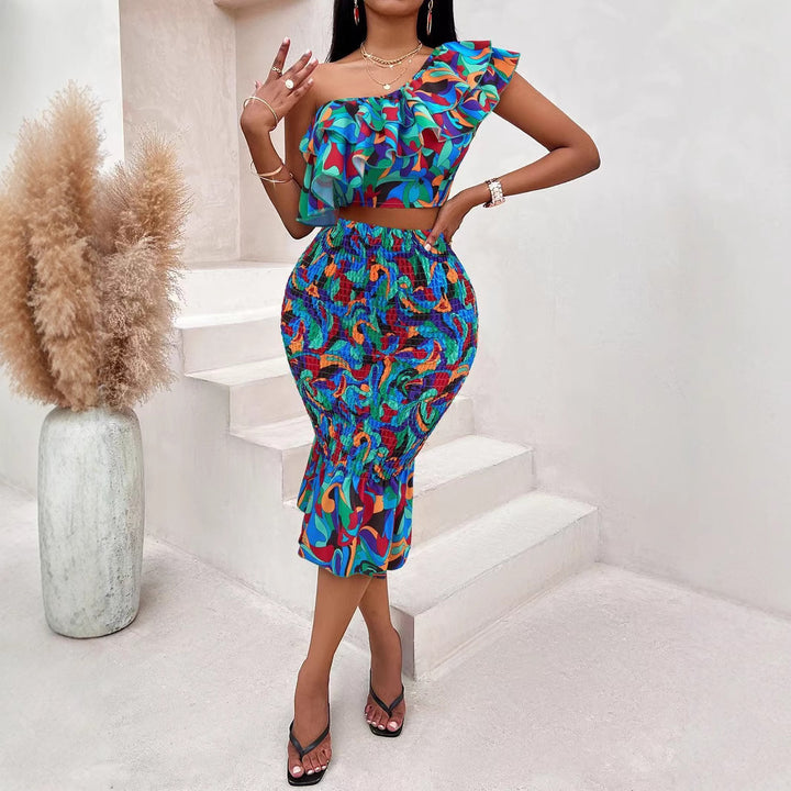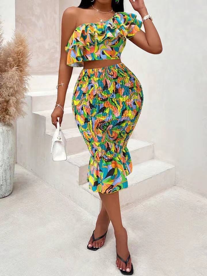 European and American women's clothing new sexy slanted shoulder printed navel top, medium and long hip skirt set