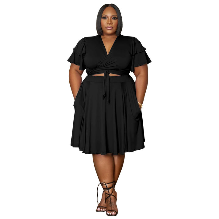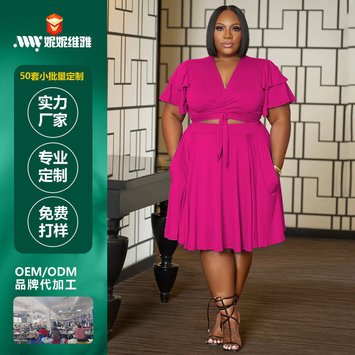 European and American women's clothing 's new lotus leaf sleeve lace-up short skirt pocket V-neck large-size skirt set, come to picture customization