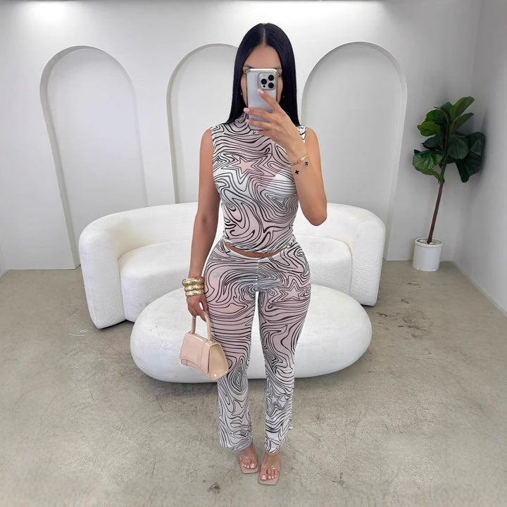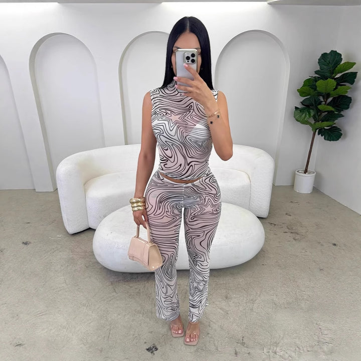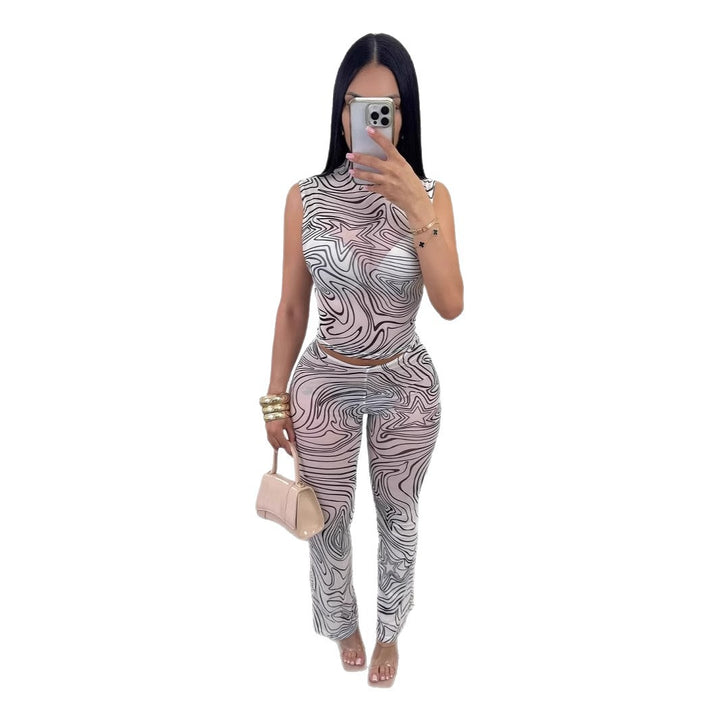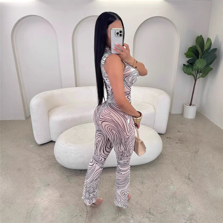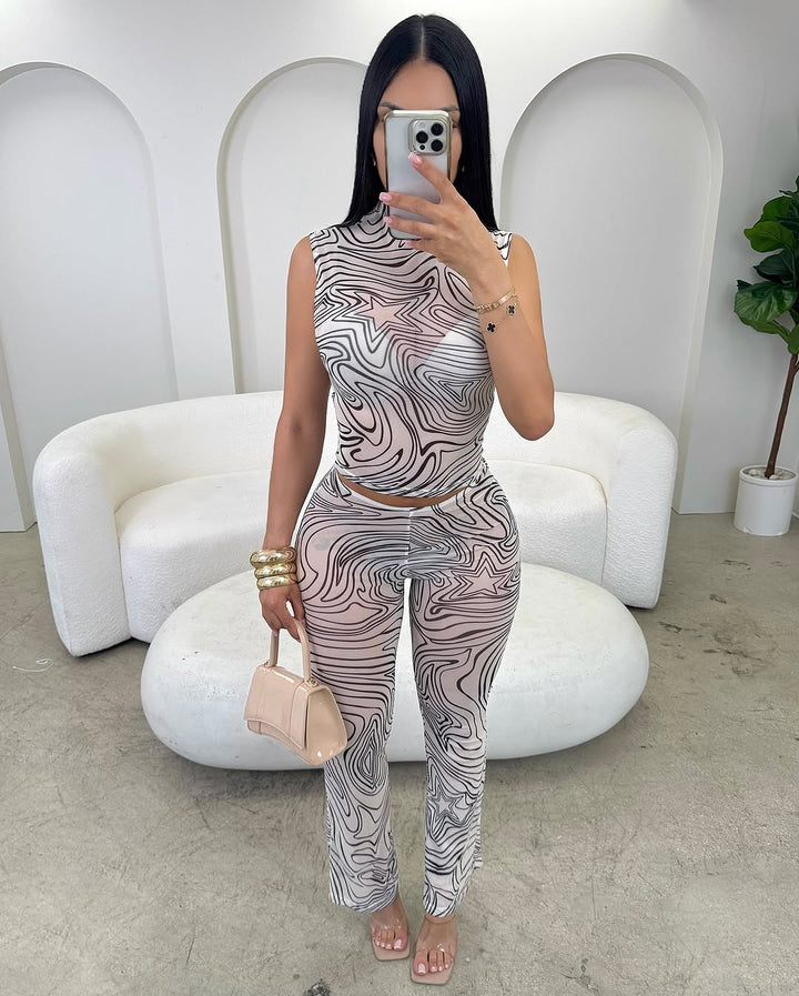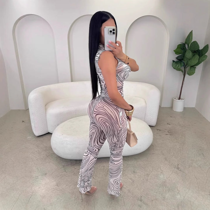 European and American women's clothing sexy mesh see-through striped printed sleeveless top ...