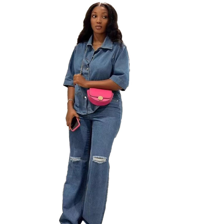 European and American women's denim jacket fashion and leisure personality ripped beggar jeans trousers suit women