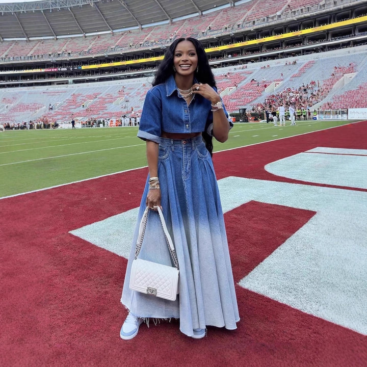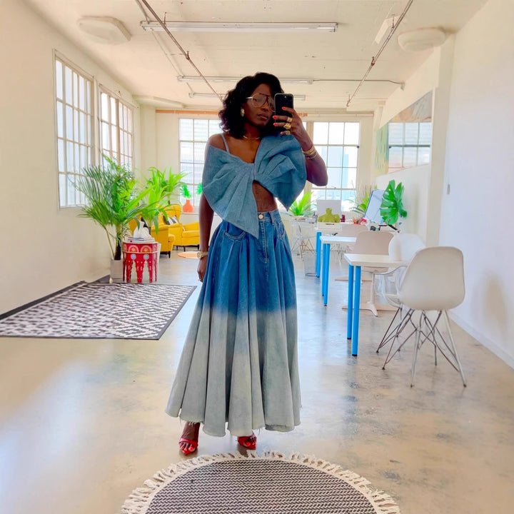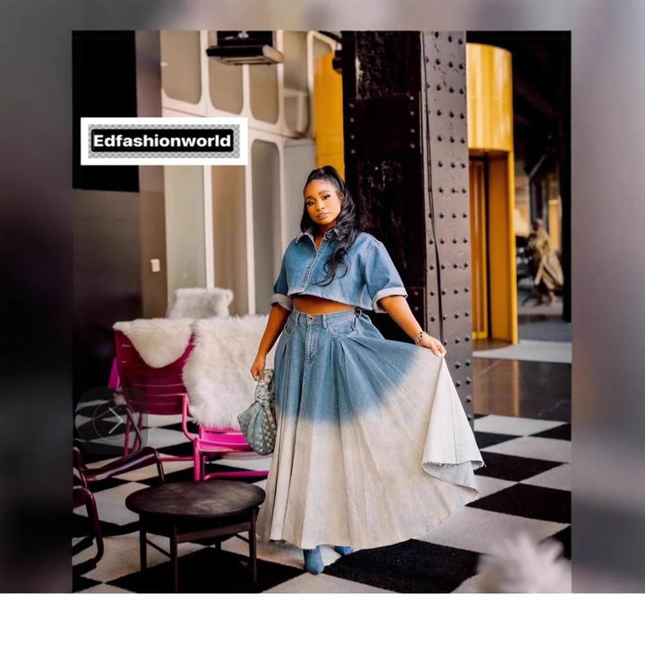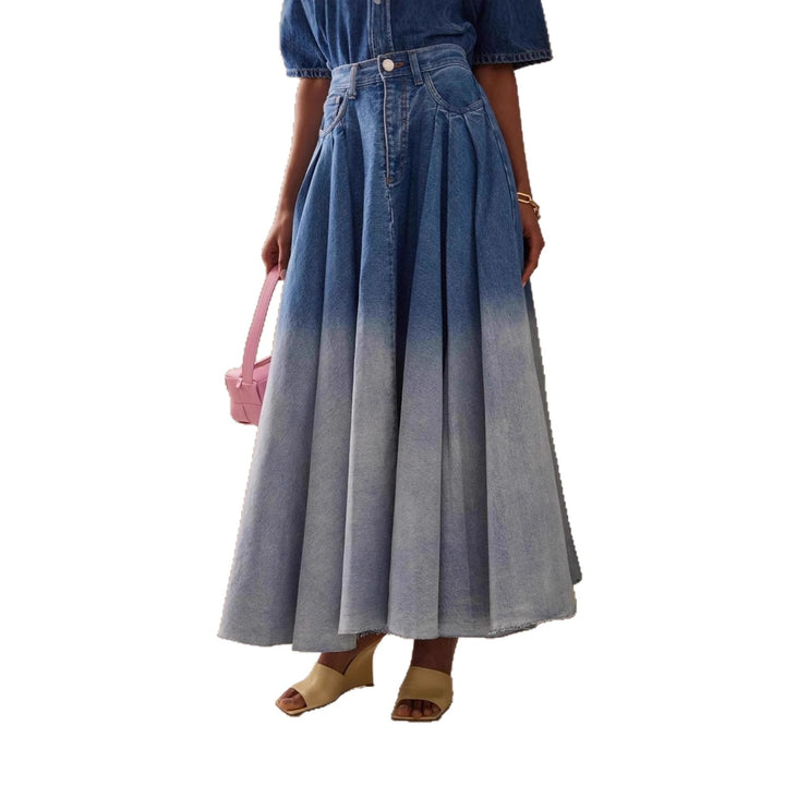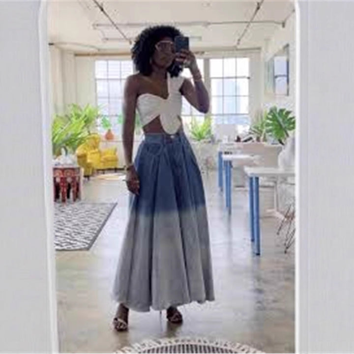 European beautiful women's denim skirt women's fashion washed solid color drawstring high waist gradual change dress