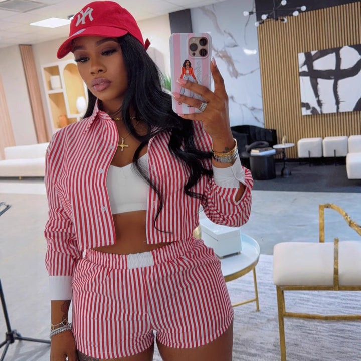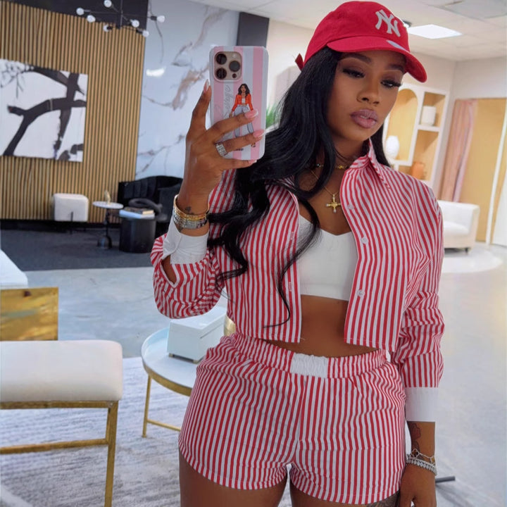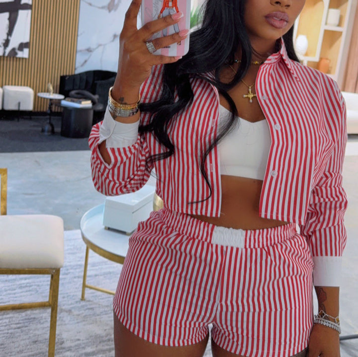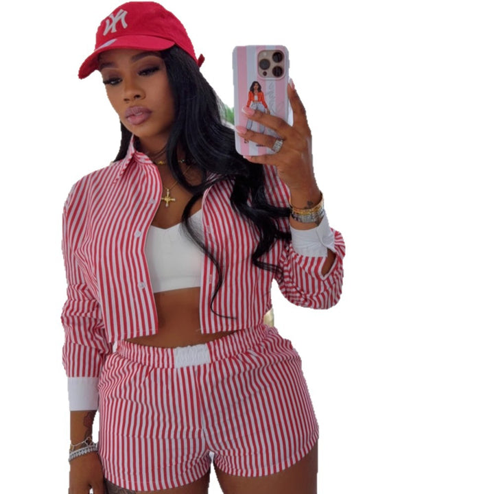 European beautiful women's lazy style striped splicing long-sleeved shirt women's casual shorts African women's fashion casual suit
