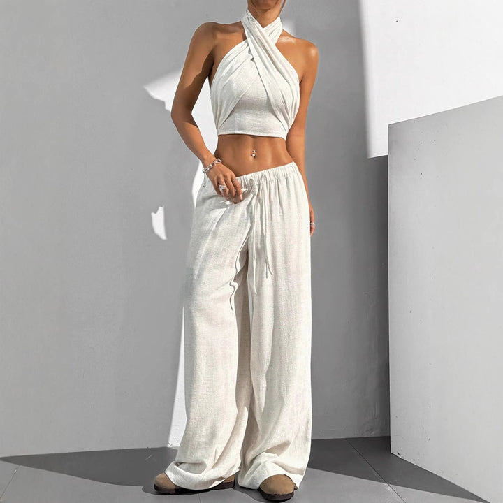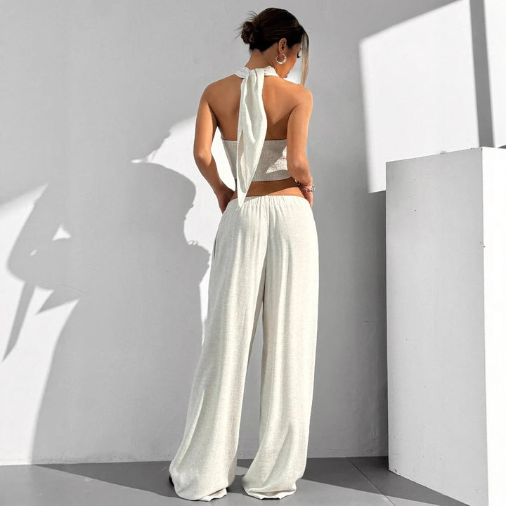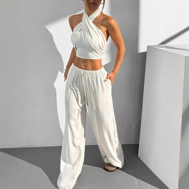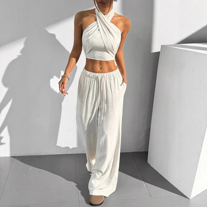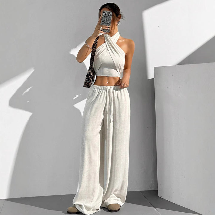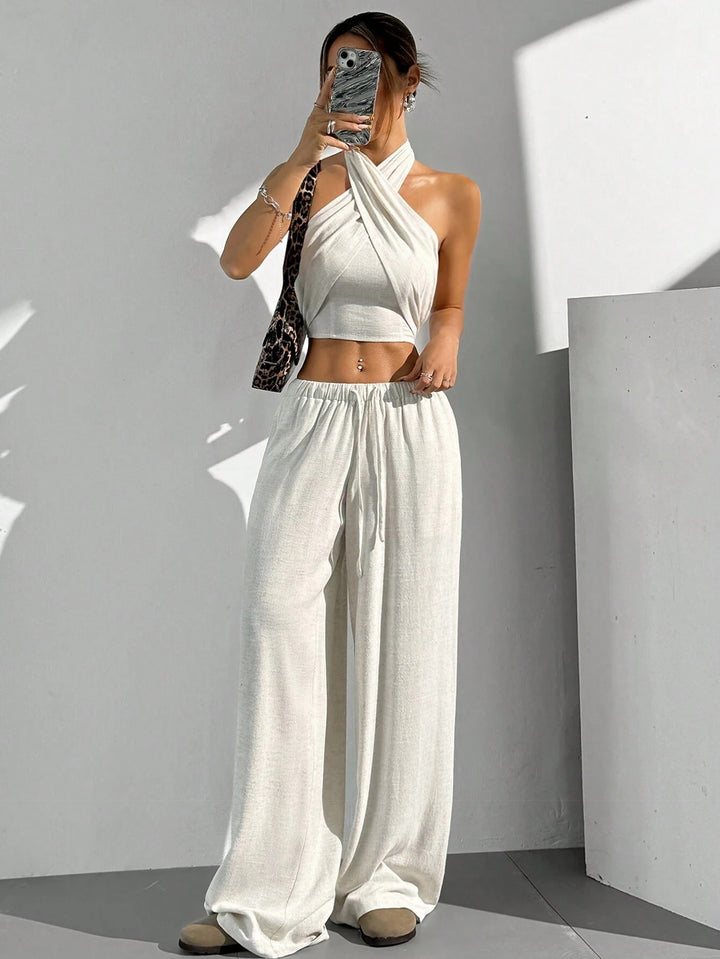 EZwear 2-piece set, women's summer solid color halter sleeveless top and drawstring waist tro...