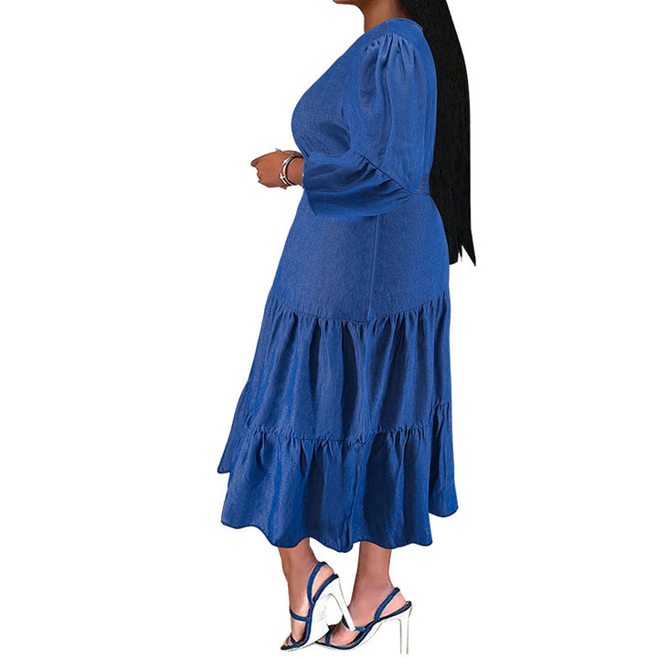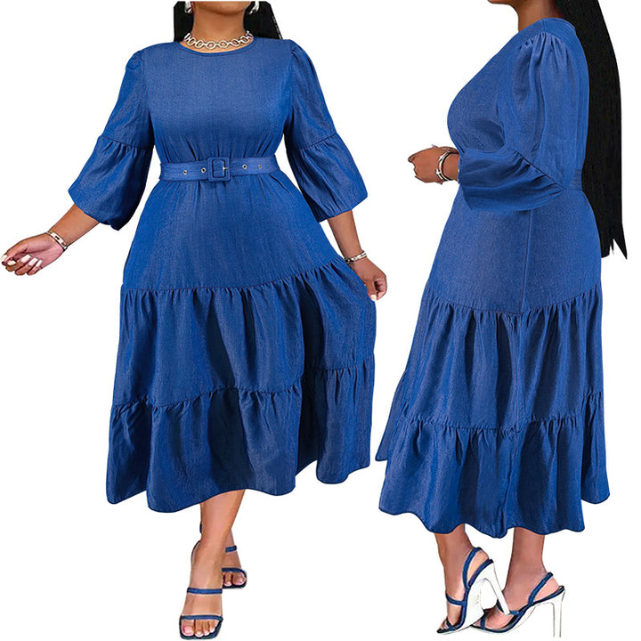 F218373 European and American women's denim dress pleated skirt including belt micro-reflective discoloration new model