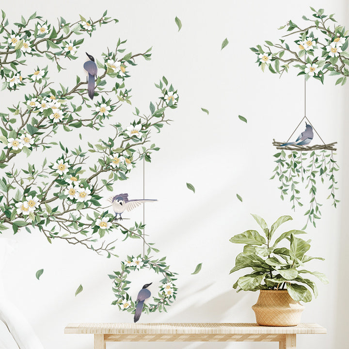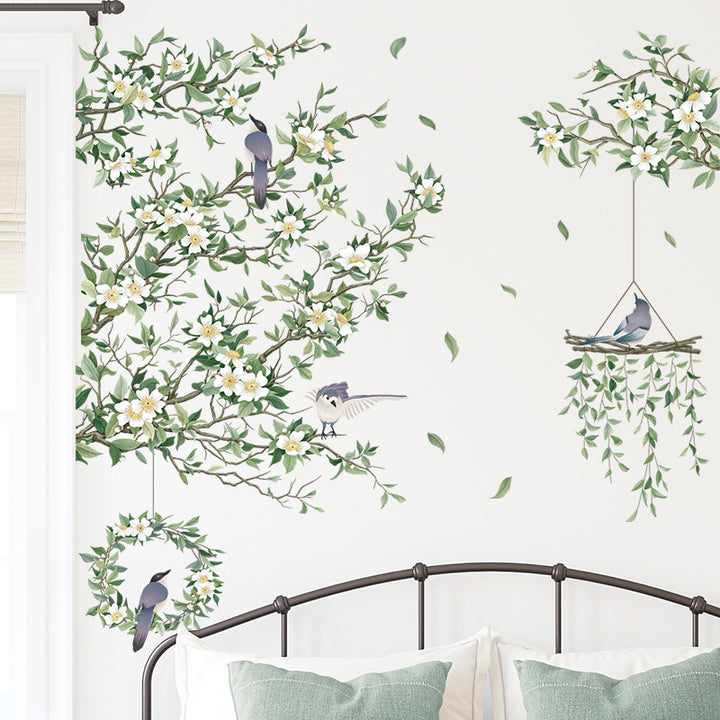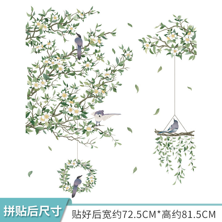 Factory direct sales fresh green leaf plant background wall paper flying bird orchid bedroom sofa decoration PVC wall sticker