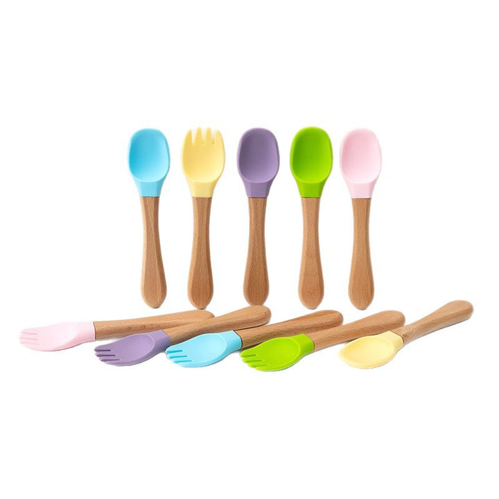 Factory direct sales silicone wooden handle complementary food fork and spoon baby spoon baby training eating fork and spoon set wholesale