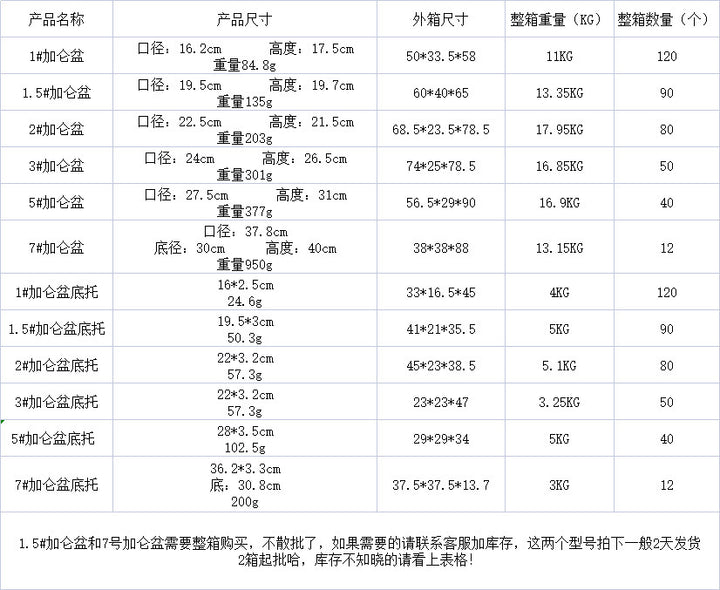 Caliber 16.2 Height 17.5 (No. 1 gallon basin, starting from FCL), Caliber 22.5 Height 21.5 (No. 2 gallon basin, starting from FCL), Caliber 24 Height 26.5 (No. 3 gallon basin, starting from FCL), Caliber 27.5 Height 31 (No. 5 gallon basin, starting from FCL), Caliber 16 Height 2.5 (No. 1 gallon basin bottom support, starting from FCL), Caliber 22 Height 3.2 (No. 2 gallon basin bottom support, starting from FCL), Caliber 22 Height 3.2 (No. 3 gallon basin bottom support, starting from FCL), Caliber 28 Height 3.5 (No. 5 gallon basin bottom support, starting from FCL) |