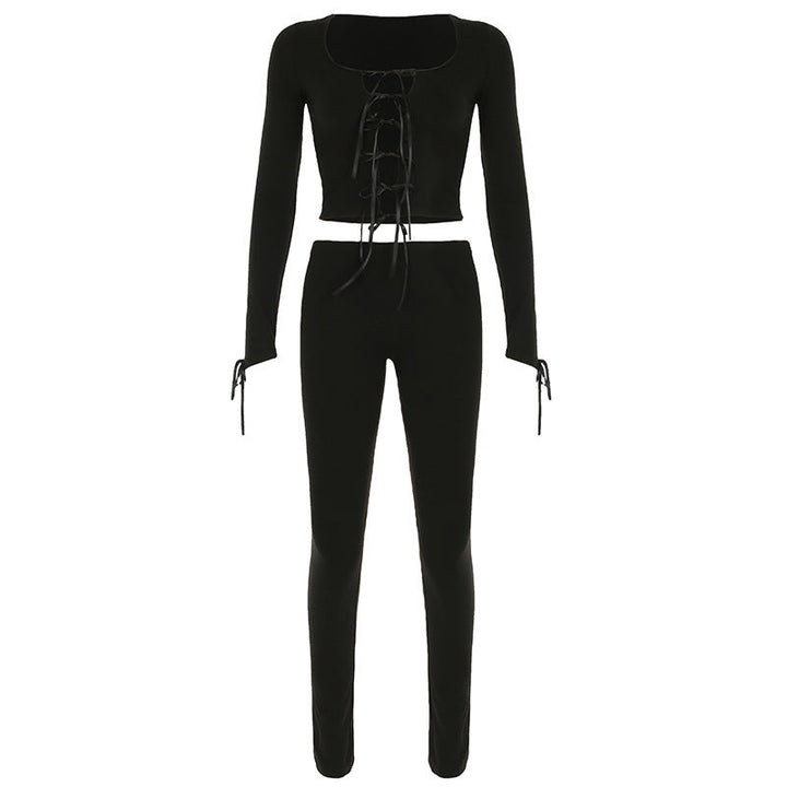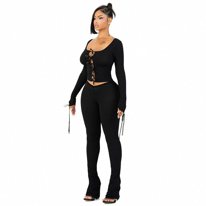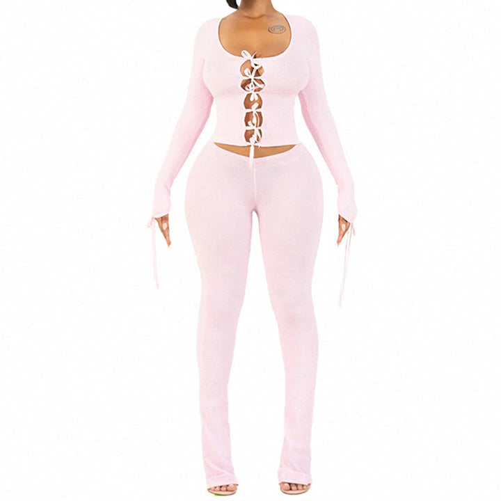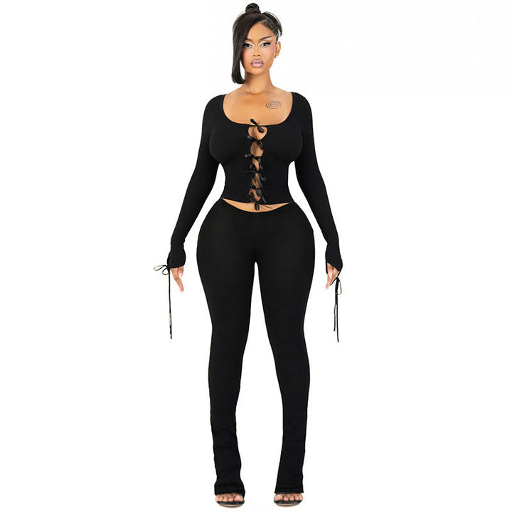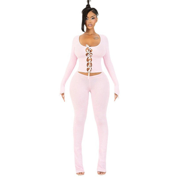 Fashion Street Casual Suit Long Sleeve Bow Tie Hollow Button Top + Trousers Two-piece Set