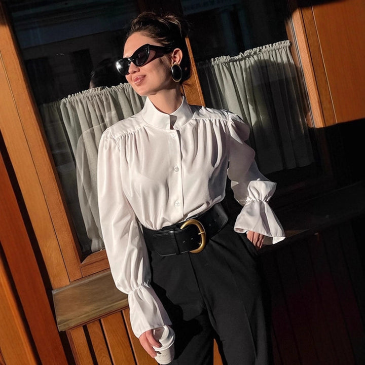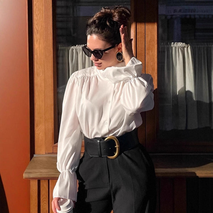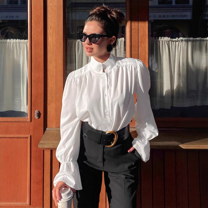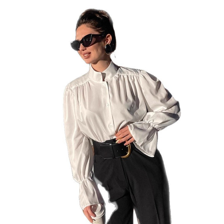 Fashion temperament French white bubble sleeve shirt women's 2025 autumn commuter cotton drape stand-up collar top women's clothing