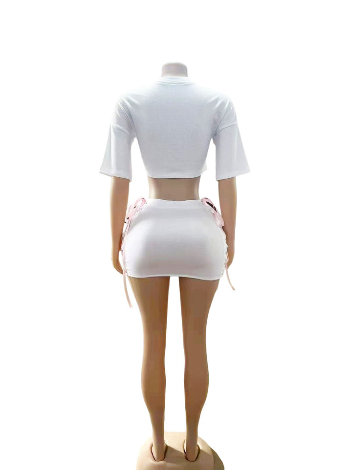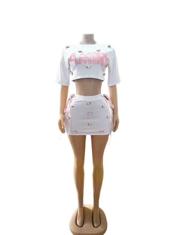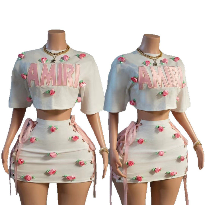 FC1369 European and American sexy babes three-dimensional rose decoration exposed button T-shirt short skirt set