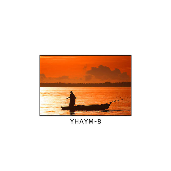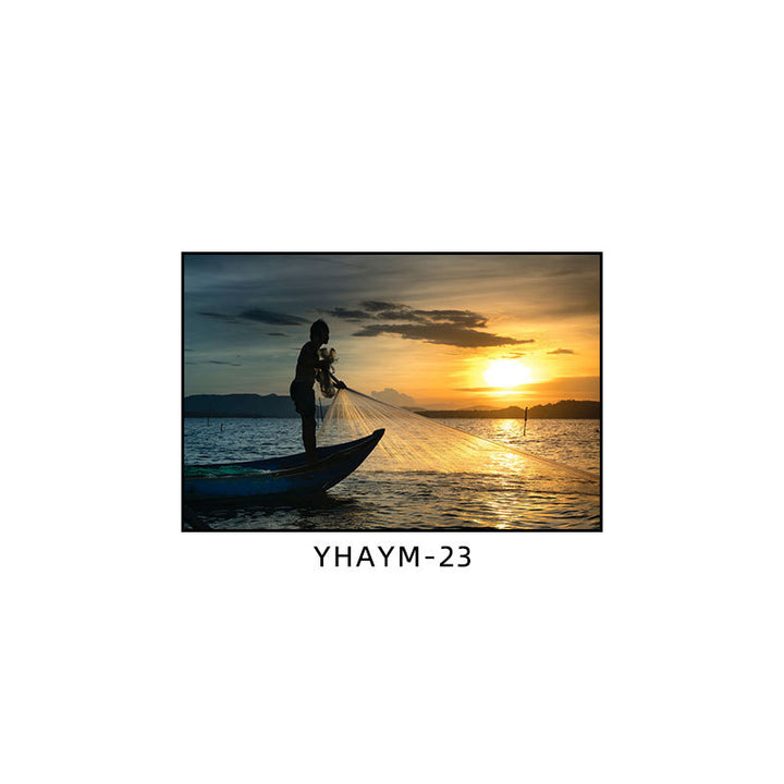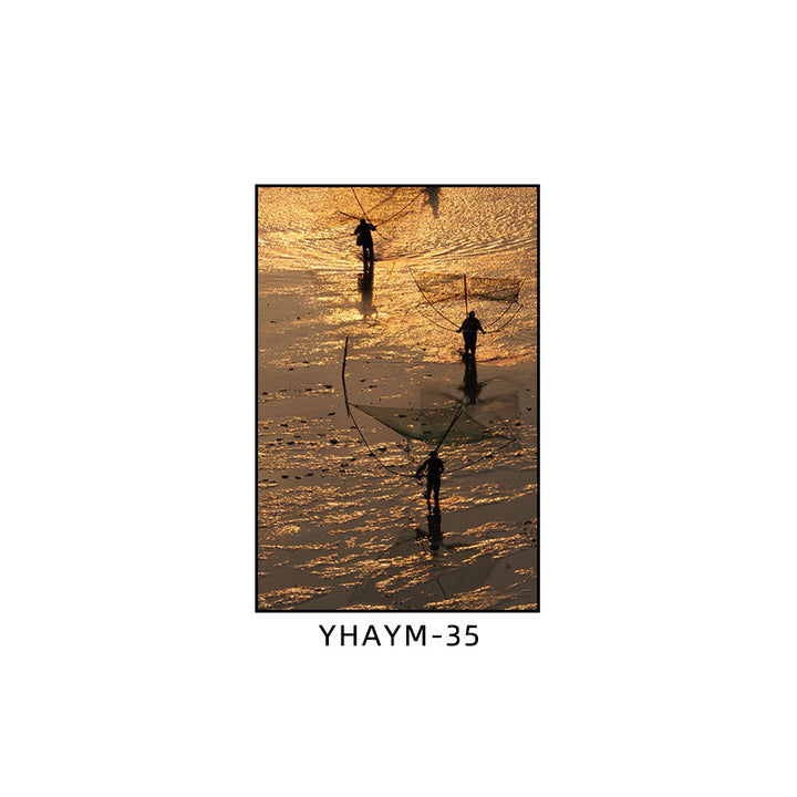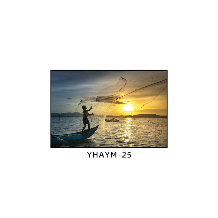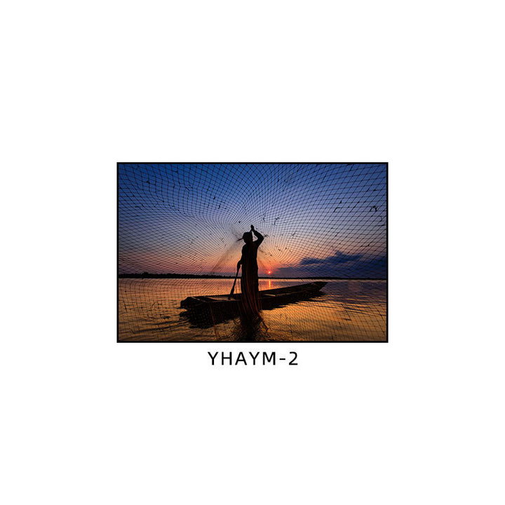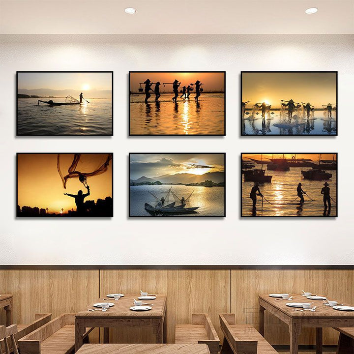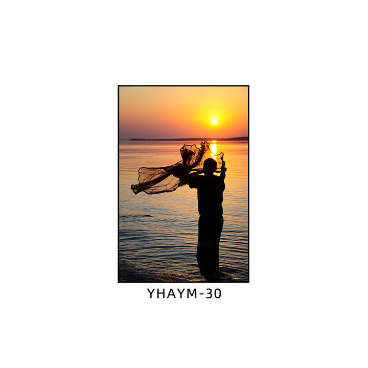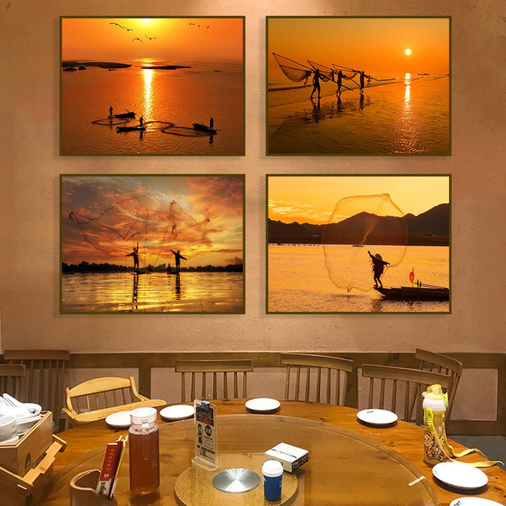 Fisherman throwing net fishing decorative painting at dusk coast scenery hanging painting sea...