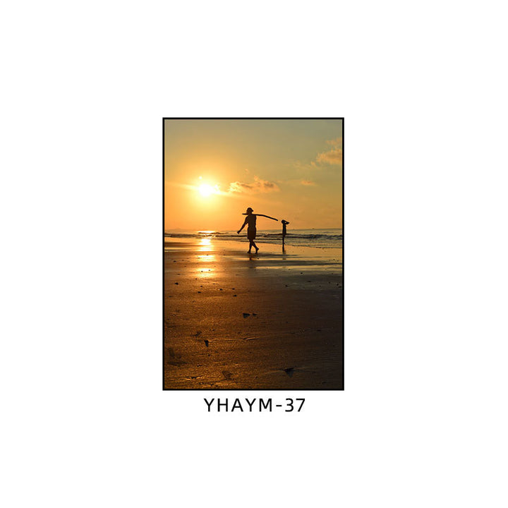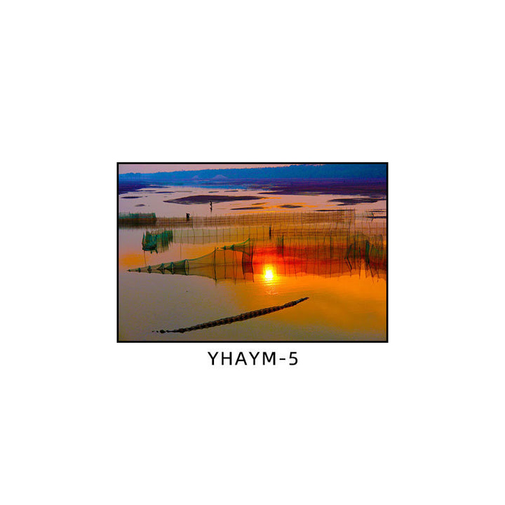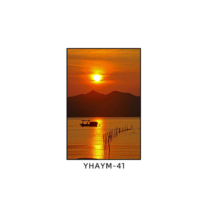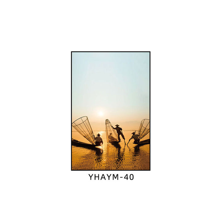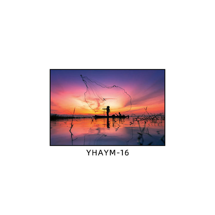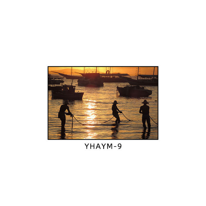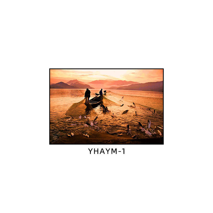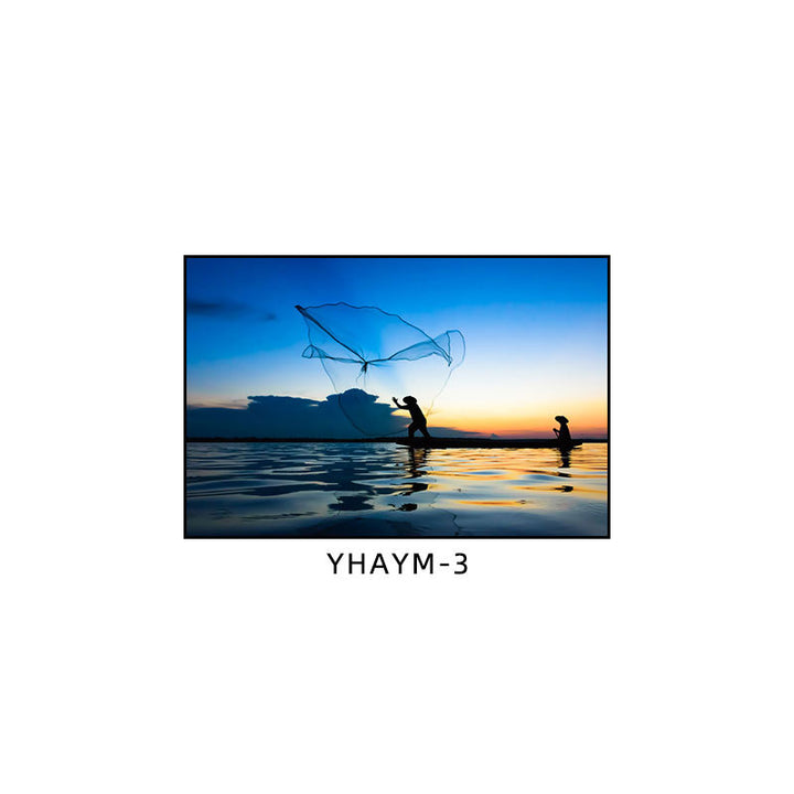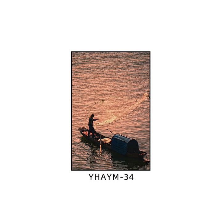 Fisherman throwing net fishing decorative painting at dusk coast scenery hanging painting sea...