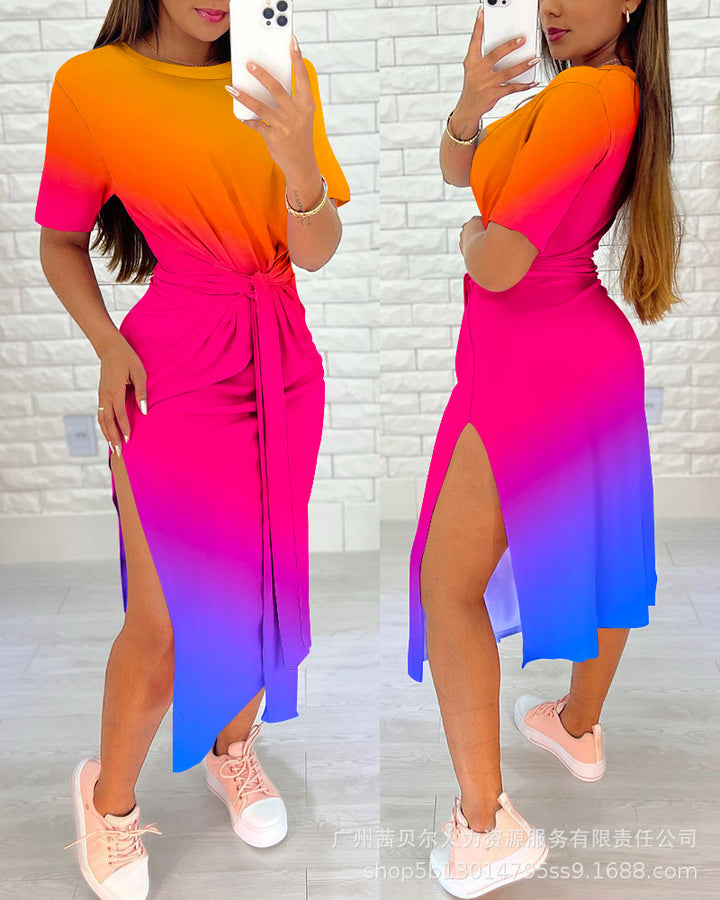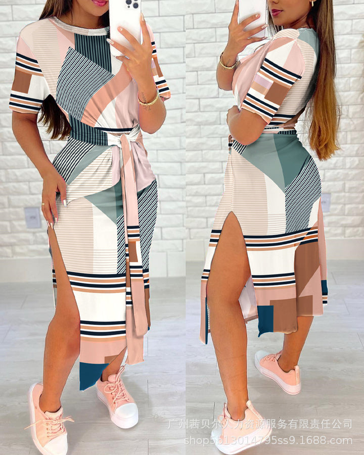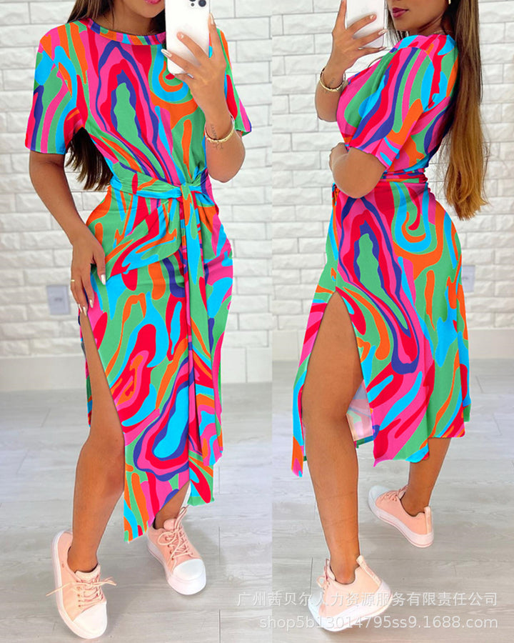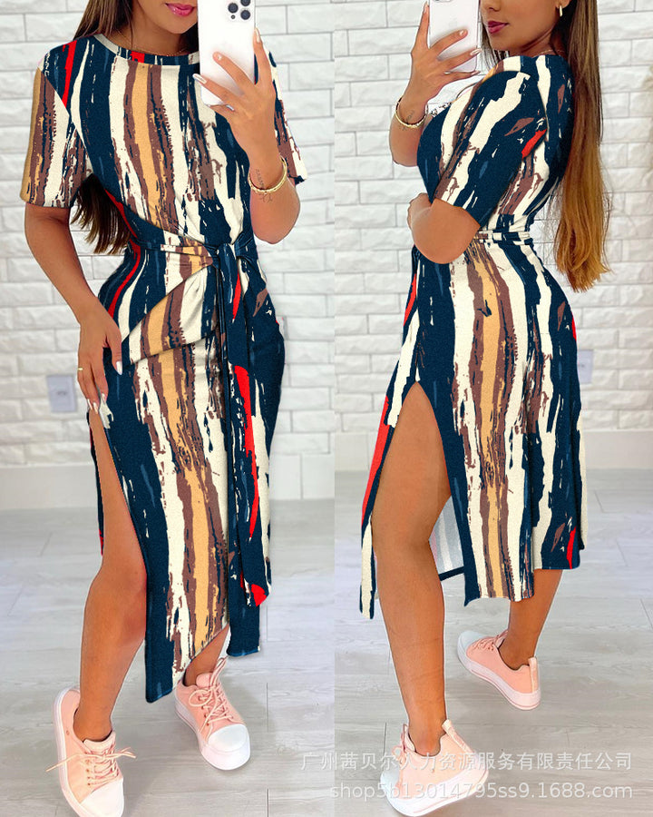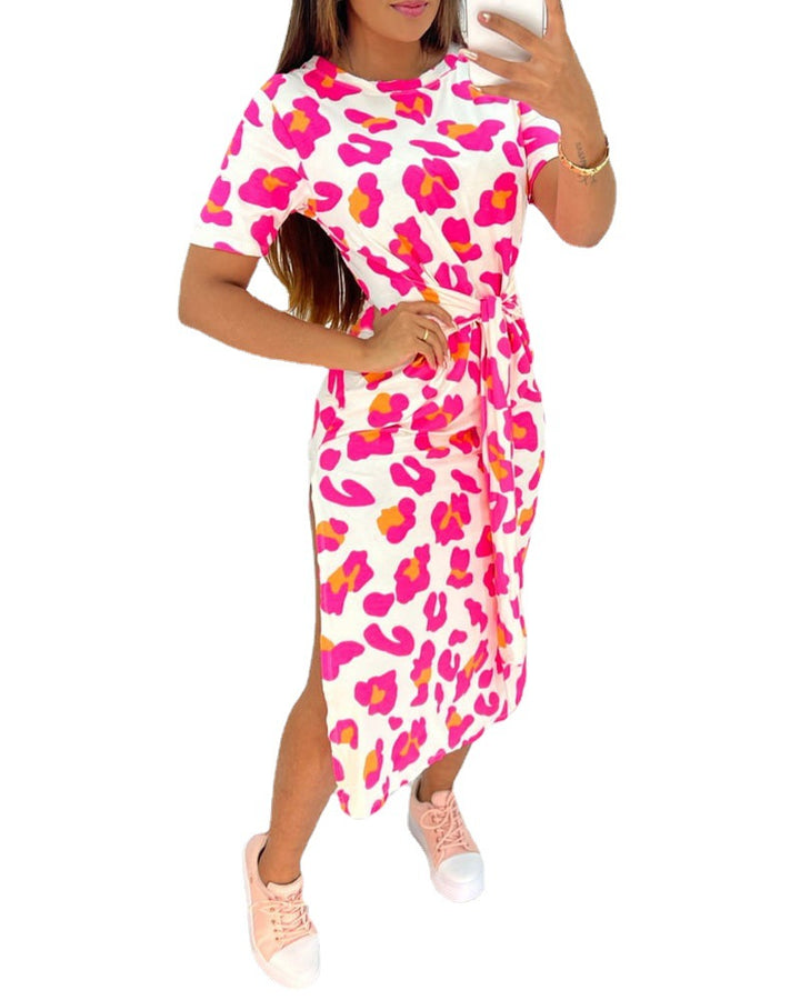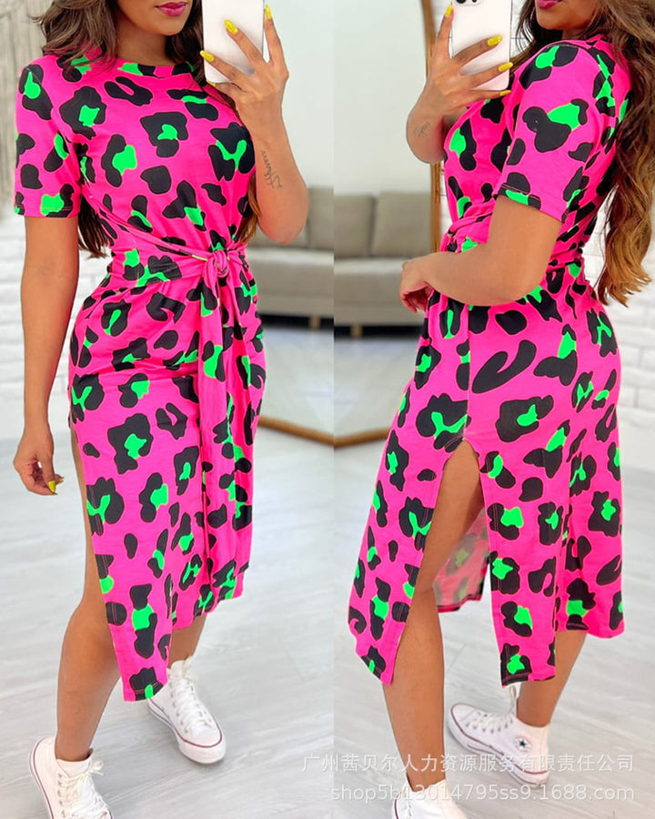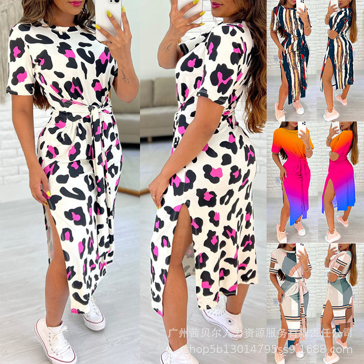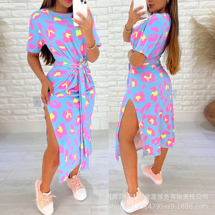 Foreign trade 2023 European and American light blue full leopard print short sleeves waist straps casual skirt