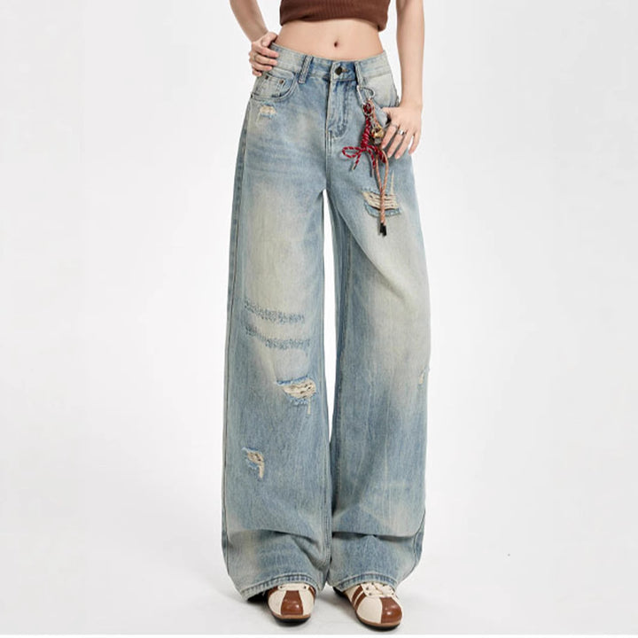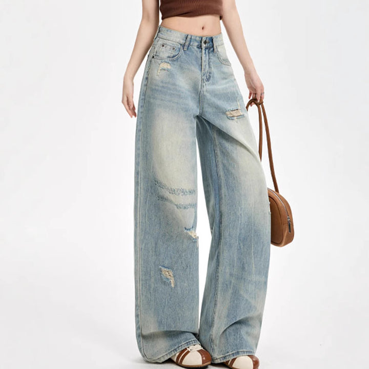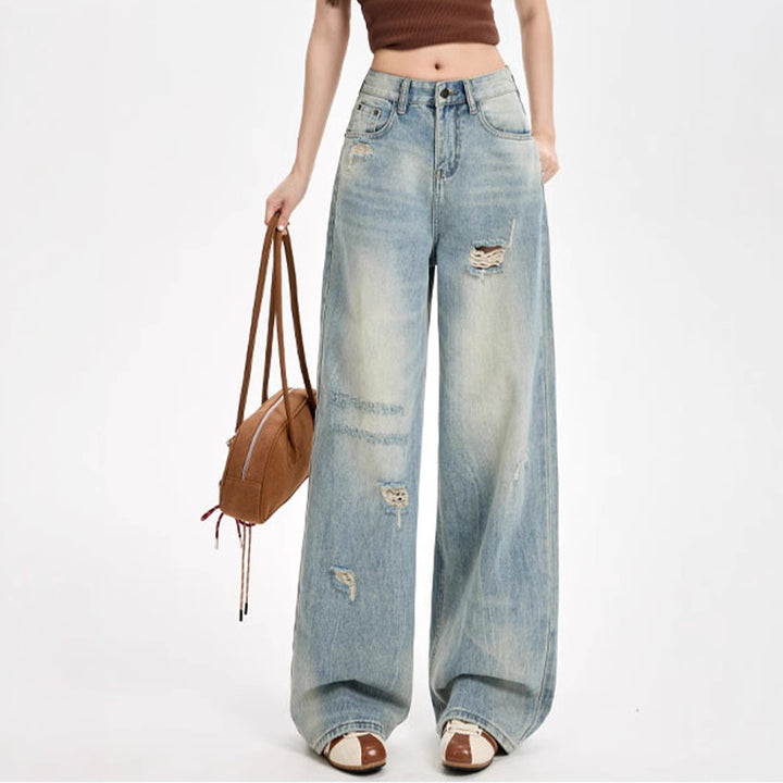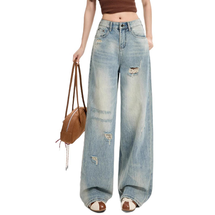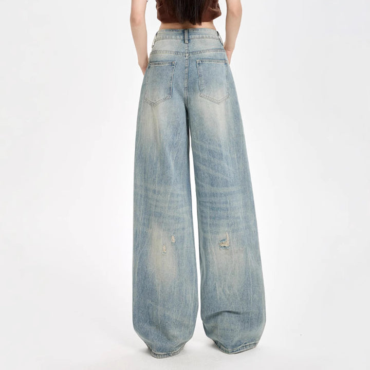 Foreign trade American street trendy brand high waist wide leg jeans women's summer wear and tear design sense loose straight drape